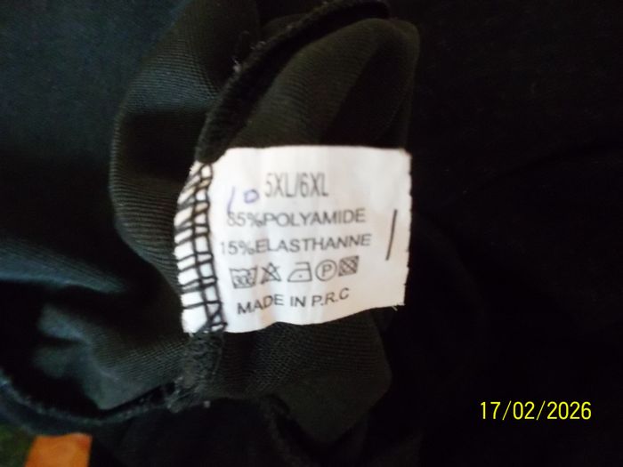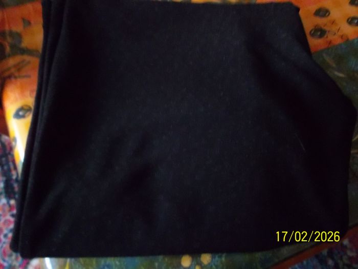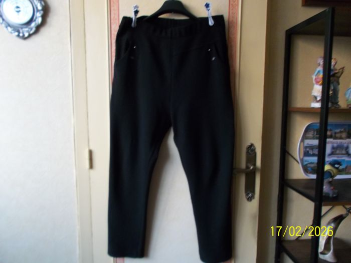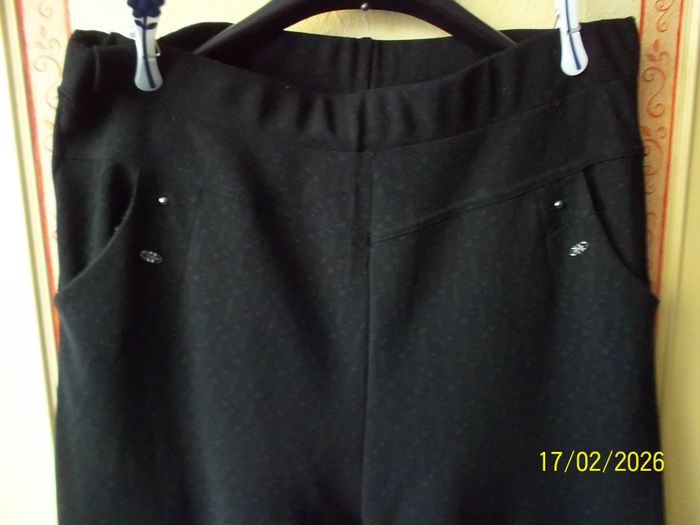 PANTALON T 52-54. Ceinture élastique. Taille 45 cm et 55 cm étiré. Couleur noir petits motifs. Poches (donne de l'aisance). 85%Polyester 15%élastane. Porté 2 ou 3 fois (trop grand). Epais. Etat neuf