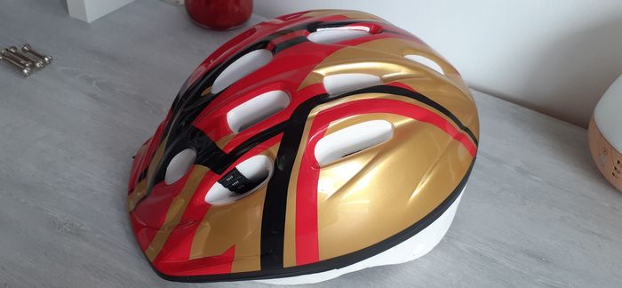 Casque vélo " Décathlon" taille S (48 à 52 cm) Couleur: rouge et doré Poids: 200G En très bon état