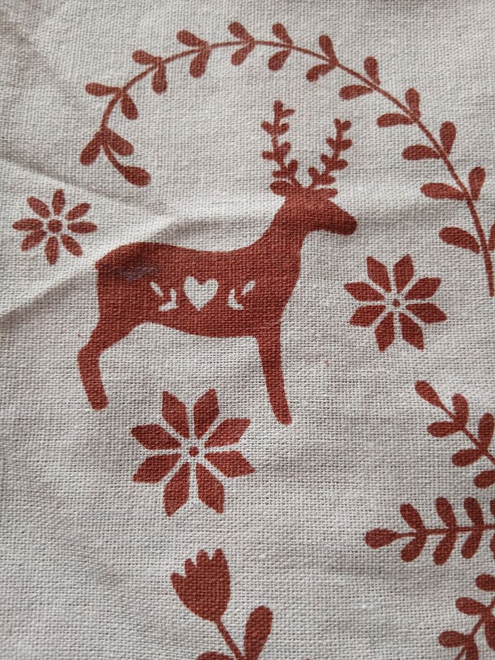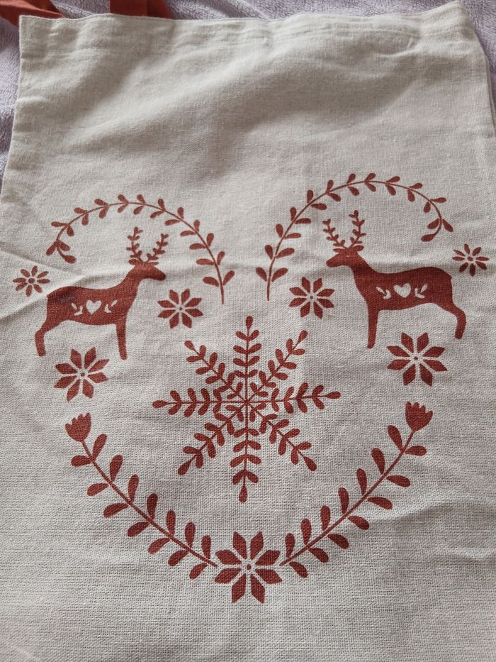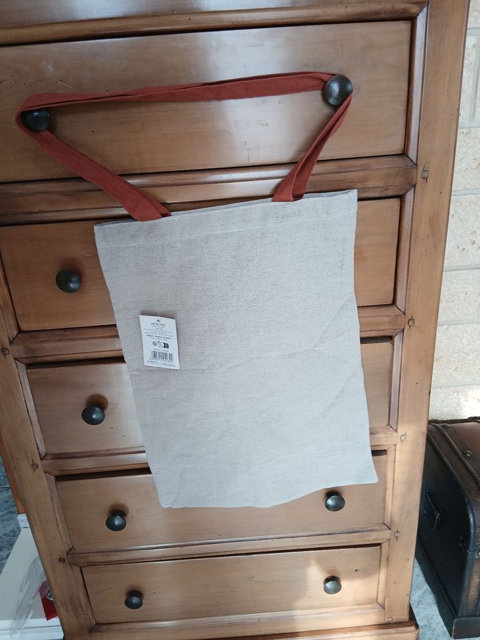 Article Neuf, encore étiqueté. Sac en toile avec anses; motifs imprimés devant et dos uni. Coloris beige et bordeaux. Format [ sans anses] 41 X 31,5 cm // voir photos pour détails