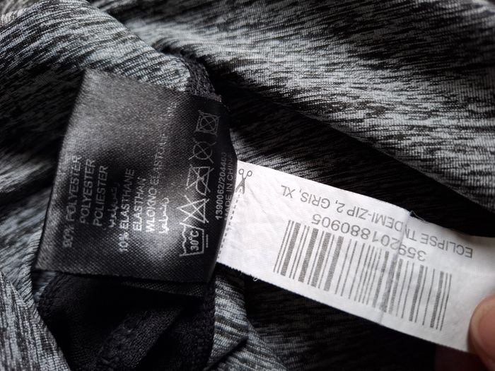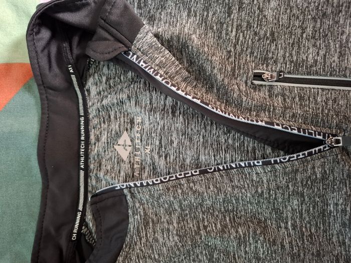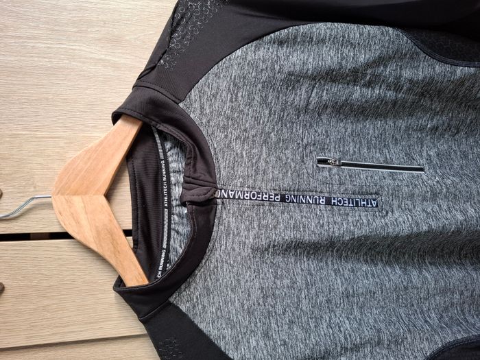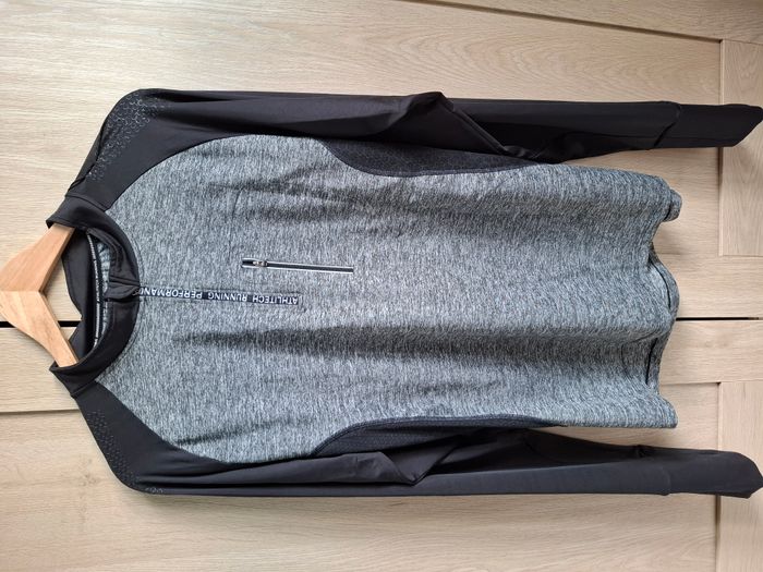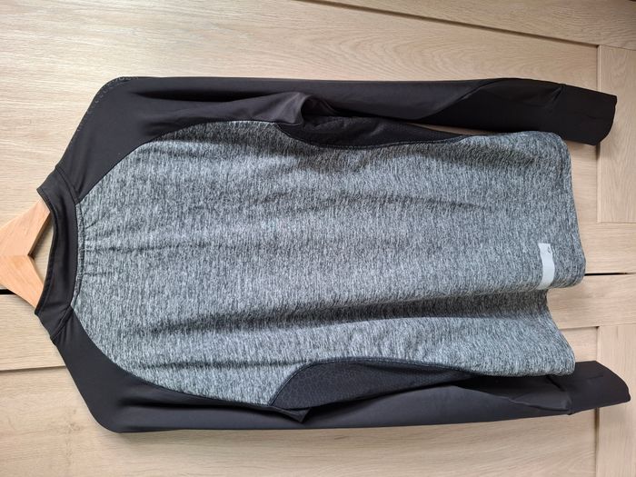 Haut gris et noir pour courir, semi zippé. Petite poche sur le devant. En très bon état