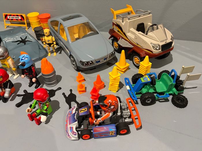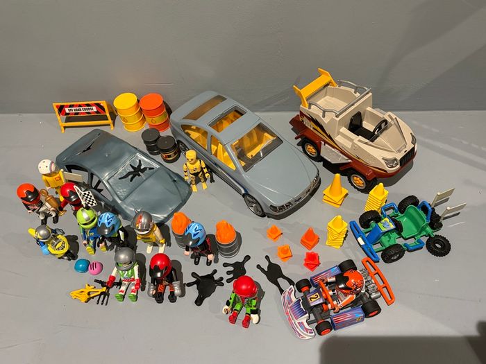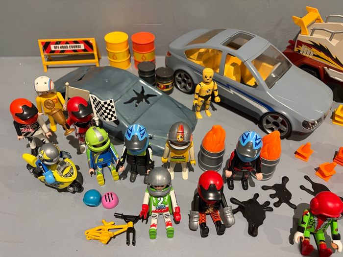 Playmobil cascadeurs lot XXL 2 karts 2 véhicules dont carrosserie supplémentaire 1 motobike 13 personnages 77 Accessoires Casques, drapeaux, nombreux plots, bidon, panneau, taches d’huiles