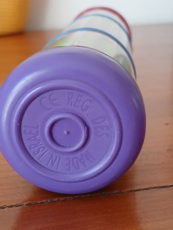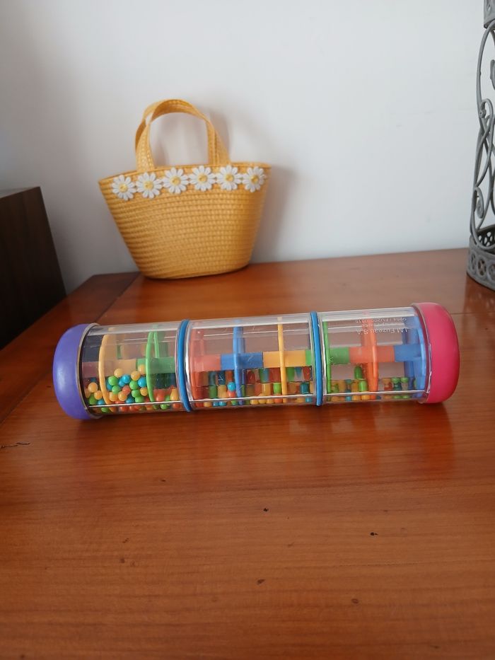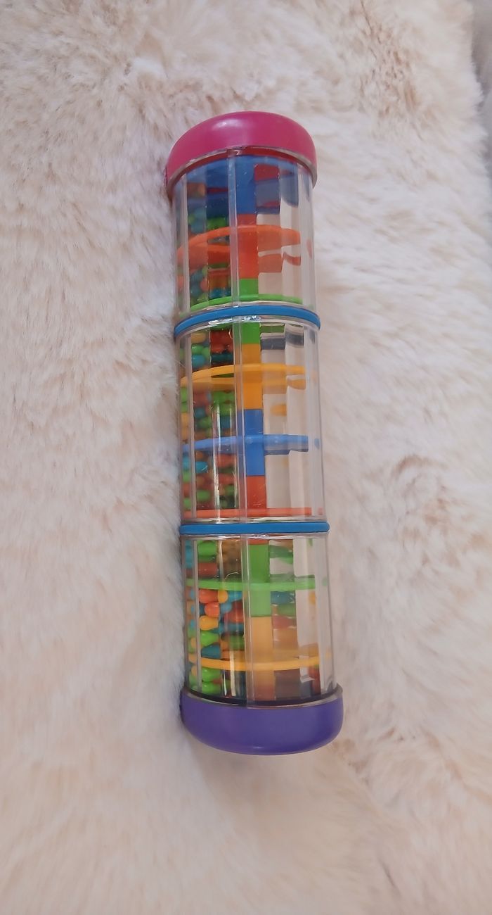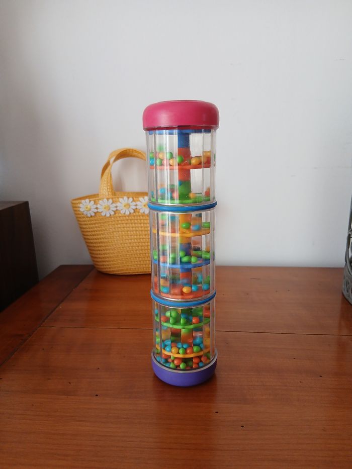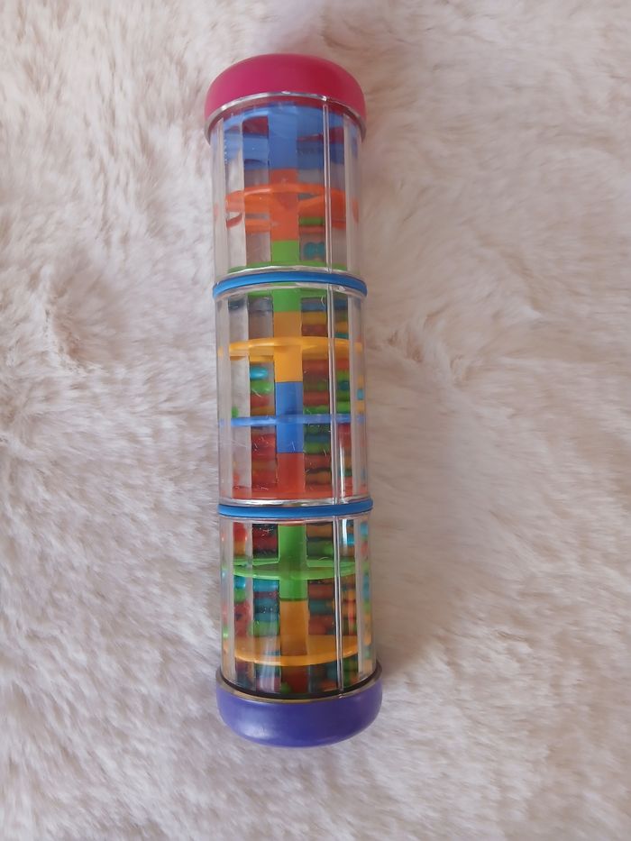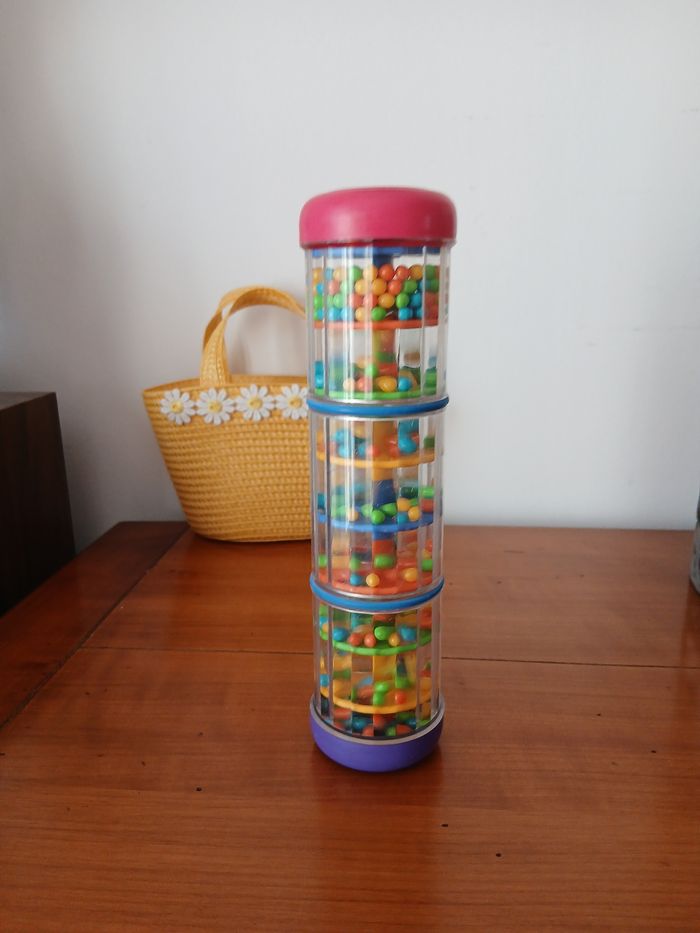 Bâton de pluie avec billes multicolores. Plusieurs rondelles percées laissent passer les billes. Corps en plastique transparent; embouts en plastique coloré. Hauteur totale de 20 cm // voir photos pour détails. À Noter : qq marques intérieures dûes au frottement des billes