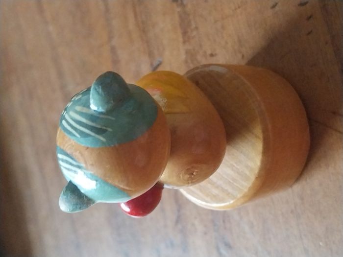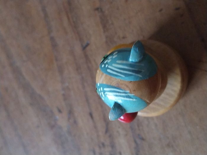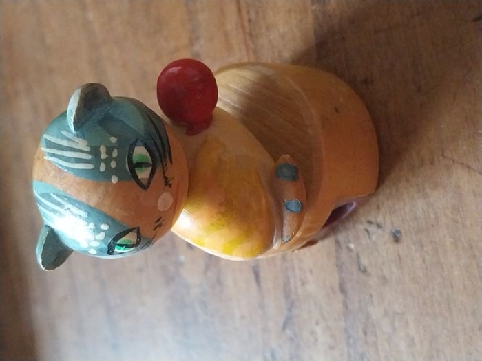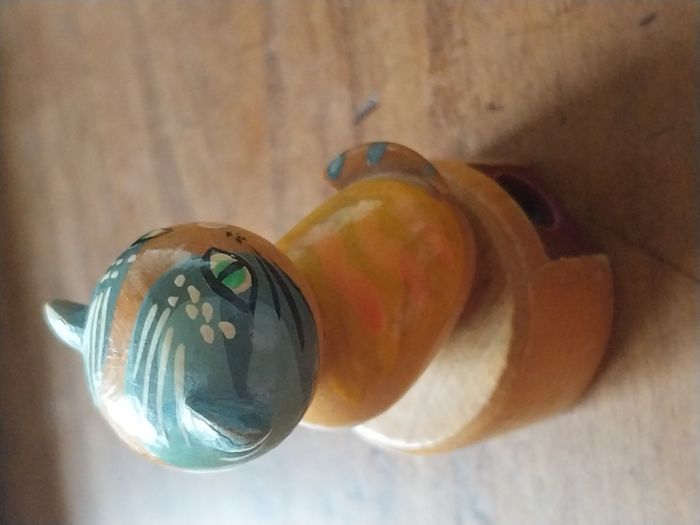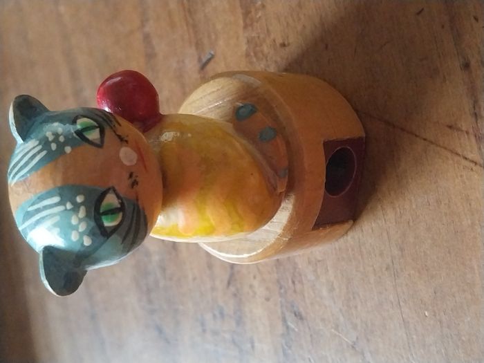 un taille-crayon en bois en forme de chat, peint à la main, au style vintage/ancien. C’est un petit objet à la fois utile et très décoratif, parfait pour un bureau, une trousse, une chambre d’enfant, ou une collection d’objets rétro. Le chat est joliment détaillé : yeux verts, motifs peints (rayures + petits points), et une petite boule rouge sur la tête. L’ensemble est en bois verni, agréable en main. Fonctionnel : le taille-crayon est intégré dans la base (voir photo du dessous). Original : look rétro, objet sympa à offrir ou à exposer. État : Bon état général pour son âge / usage Traces normales : petites marques et micro-rayures visibles sur la peinture/vernis (voir photos) La lame et la vis sont en place (photo du dessous) Dimensions : 3cm x 5,5 cm environ Format “petit objet de bureau”, tient facilement dans la main. Idées d’utilisation Taille-crayon de bureau / école Petite déco vintage Cadeau original (rentrée, maître/maîtresse, amateur de chats) Collection d’objets en bois / rétro
