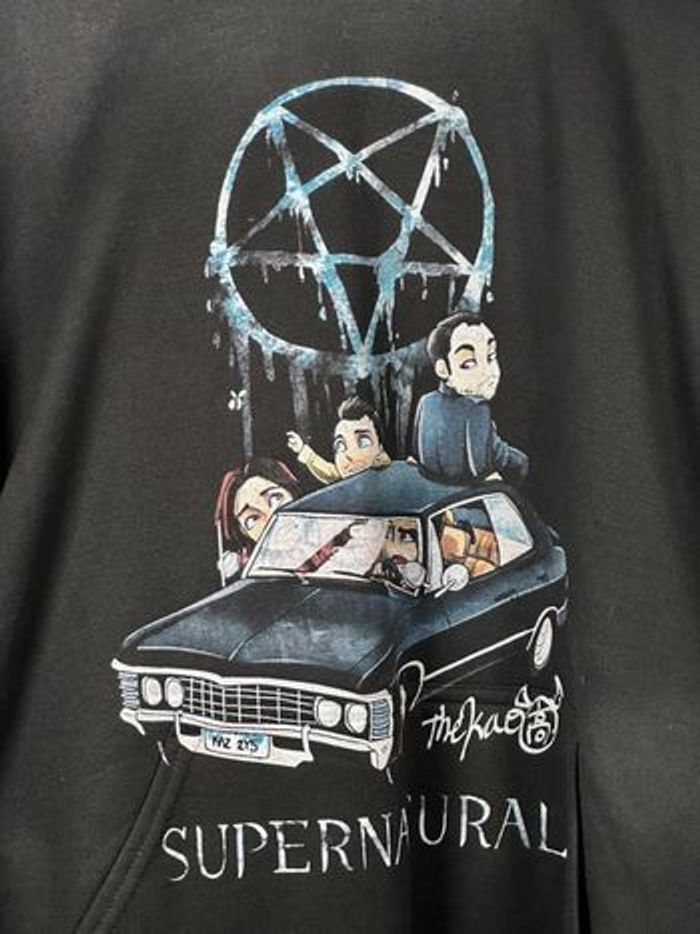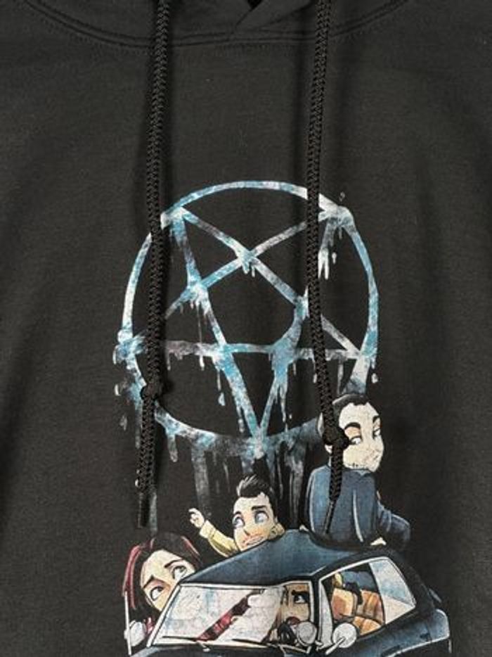 Sublime sweet à capuche Supernatural Représentant les trois personnages principaux : Dean, Sam et Castiel ainsi que l’emblématique Impala Taille L homme mais peut convenir à une femme (L/XL pour femme) Neuf
