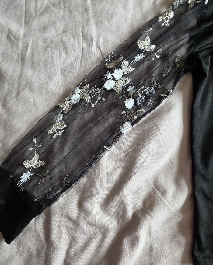 ​Haut Noir Manches Voile Brodées Fleurs Polyester Élasthanne Très bon état XL - photo numéro 5