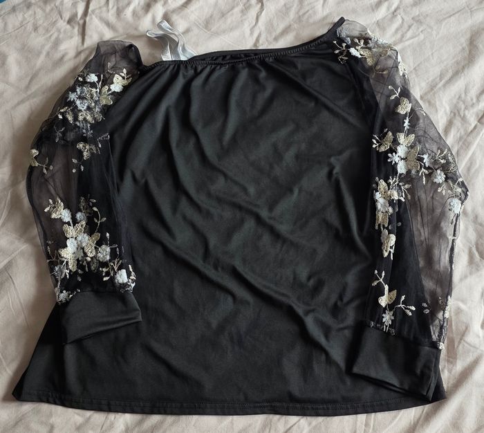 ​Haut Noir Manches Voile Brodées Fleurs Polyester Élasthanne Très bon état XL - photo numéro 4