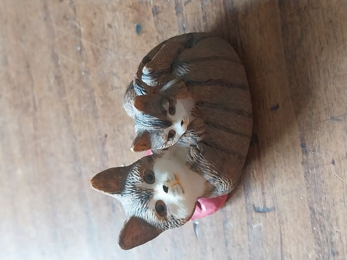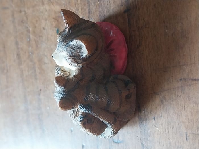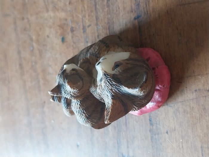 une statuette décorative représentant deux chats blottis l’un contre l’autre, posés sur un petit coussin rouge. Un objet très mignon et chaleureux, idéal pour une déco maison, une étagère, une console d’entrée, une chambre ou même comme petite idée cadeau pour un amoureux des chats. Détails : Sujet : duo de chats / chatons couchés, style réaliste Matière : résine Dimension : 5cm x 3cm Couleurs : chats brun/gris avec visage clair, coussin rouge Finition : texture “poils” bien travaillée, rendu sympa en déco État : bon état général (voir photos), pas de casse visible sur les images