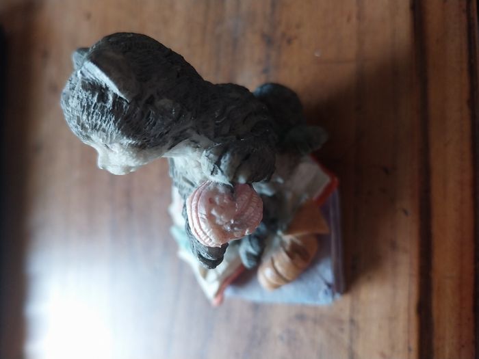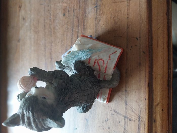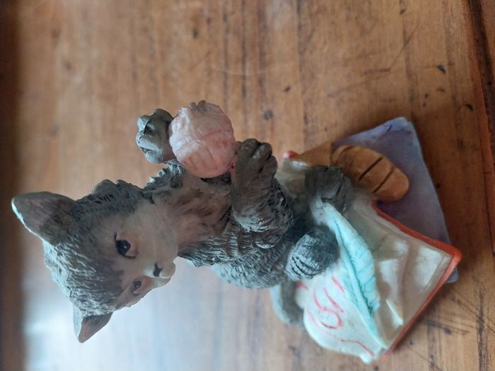une petite figurine décorative représentant un chaton gris assis, tenant une pelote de laine rose (thème tricot / couture / atelier créatif). La figurine est posée sur une base avec un coussin et des détails “accessoires” (ambiance douce et vintage). Idéale pour : déco de chambre, salon, coin lecture atelier couture / mercerie / tricot cadeau pour amoureux des chats petite collection de figurines État : figurine en bon état général peinture avec un léger aspect patiné / petites traces d’usage possibles (voir photos), ce qui lui donne un charme “objet déco” pas de casse visible sur les photos, détails bien présents (pelote, pattes, base) Dimensions : L 6.5cm x l 6.5cm x 8cm Emballage soigné N’hésitez pas à me contacter si vous souhaitez plus de photos, une mesure précise, ou toute information supplémentaire.