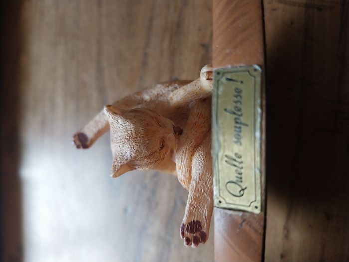 une petite statuette décorative en forme de chat, fixée sur un socle ovale imitation bois. La scène est très sympa et originale : le chat est représenté dans une posture étirée avec la queue levée, et la plaque décorative sur le socle indique : “Quelle souplesse !”. L’objet est idéal pour : décoration intérieure (étagère, bureau, bibliothèque, entrée) cadeau original pour amateur de chats petite collection de figurines / objets déco Détails / caractéristiques : Figurine de chat coloris beige / roux avec détails (pattes, rayures) Socle ovale aspect bois, avec patin noir dessous (plus stable, protège les meubles) Plaque décorative sur le socle : “Quelle souplesse !” Style : déco / humour / animalier État : Bon état global. Présente quelques petites marques d’usage légères possibles (voir photos), mais rien de cassé et l’ensemble reste propre et décoratif.