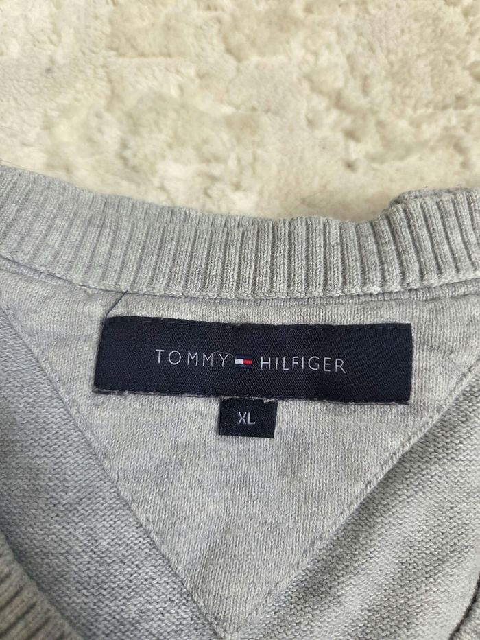 Pull gris Tommy Hilfiger à col V, confortable et facile à porter, parfait pour un style casual ou habillé. Taille : XL Matière : 100% coton État : très bon état général À noter : petit accroc visible sur la dernière photo Dimensions : Longueur : 70 cm Épaules à épaules : 49 cm Aisselle à aisselle : 58 cm Manches : 64 cm Pull de qualité, agréable à porter et facile à assortir 👍