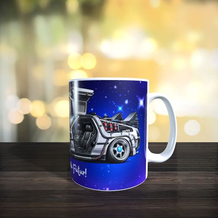 Mug avec la mytique voiture Deloreane, Retour vers le futur version caricature.