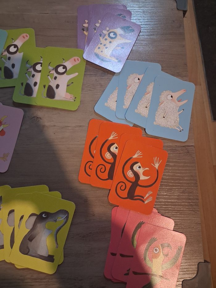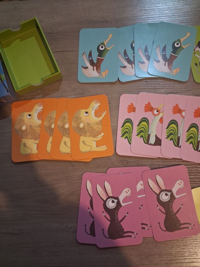Vends le célèbre jeu Batameuh de chez Djeco. ​Principe : Un jeu de bataille sonore où il faut être le plus rapide à imiter le cri des animaux. ​Ambiance : Fous rires garantis pour toute la famille ! Jeu complet et cartes en bon état.