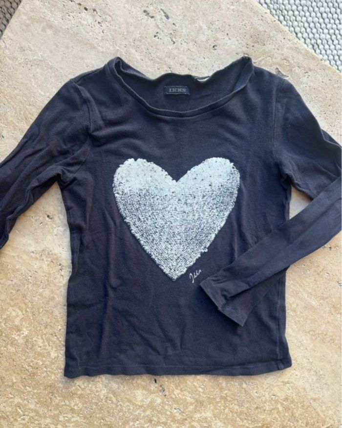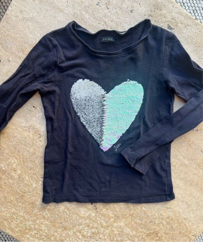 T-shirt manches longues IKKS avec gros cœur en sequins dessus, selon le sens des paillettes le cœur change de couleur. Parfait état