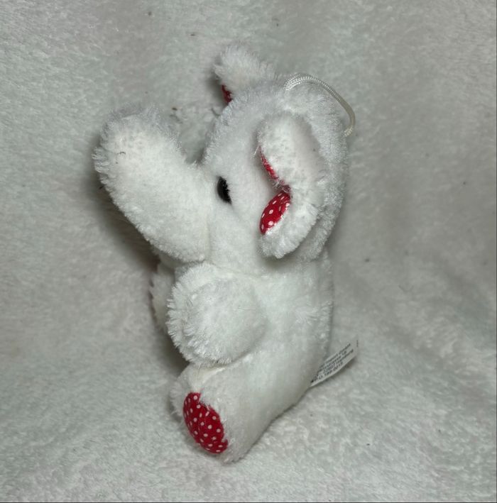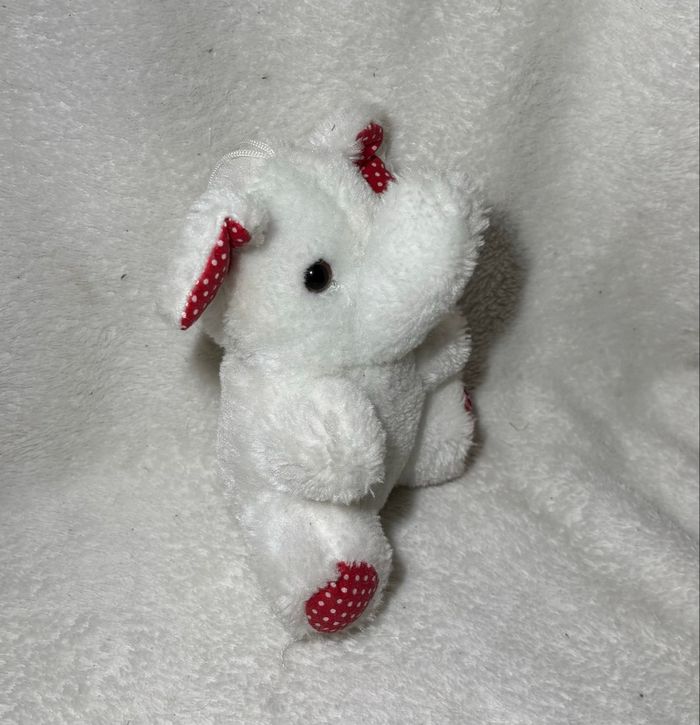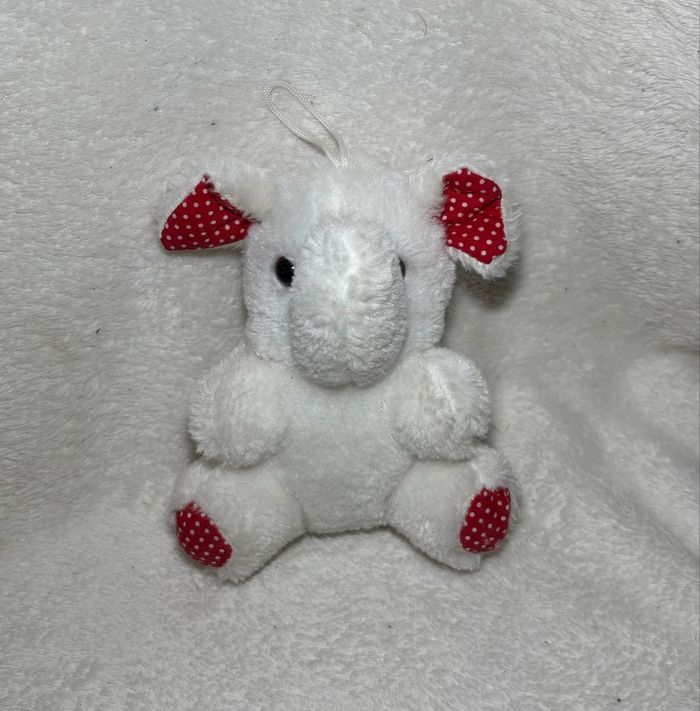 ✅ Article en très bon état 🏷️ Marque : Paul Import GmbH (Allemagne) 📏 Taille : environ 15 cm de hauteur 🎨 Couleur : blanc, rouge et pois blancs 🧼 Entretien : Lavable à la main (indiqué sur l'étiquette) 🎀 Détails : ✨ Peluche toute douce et bien rembourrée 🐘 Oreilles et dessous de pattes contrastés avec un joli tissu rouge à pois blancs ➰ Équipée d'une petite boucle de suspension blanche sur le dessus de la tête 🔥 Idéal pour une collection de peluches, une décoration de chambre d'enfant ou un petit cadeau