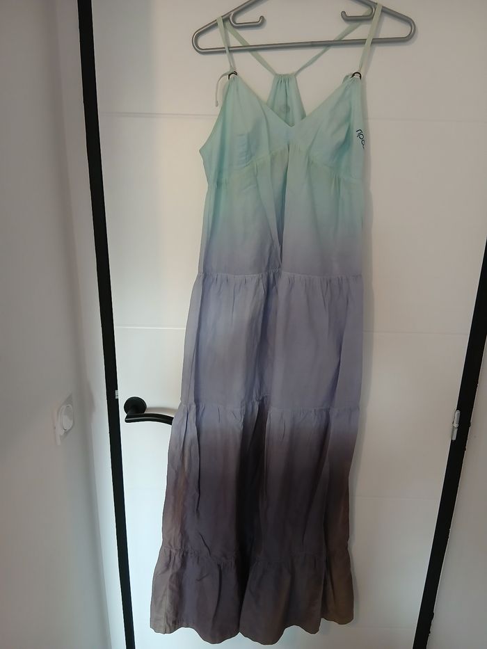 Robe longue Collector BILLABONG. Très bon état général, à peine portée. Taille: M ou 38. Couleur : tie dye bleu. Forme empire. Bretelles réglables. Fermeture zippée flanc G. Prix d'achat en boardshop : 75 euros. Vendu 40 euros.