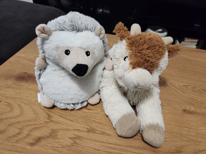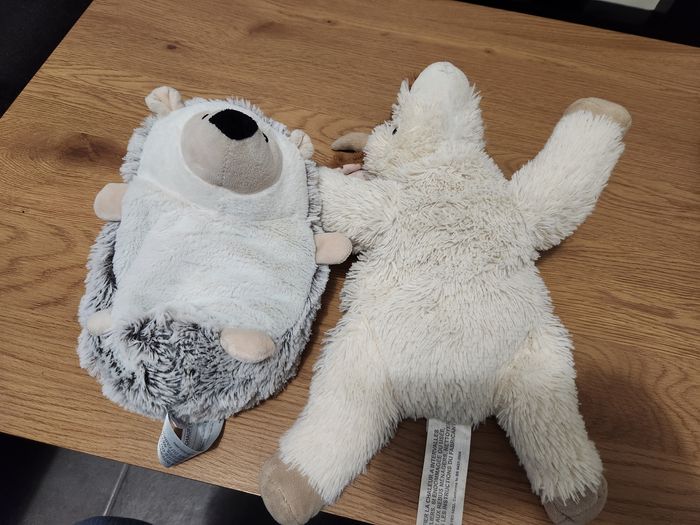 Bonjour, Je vends ces 2 bouillottes de la marque Warmies, à faire chauffer au micro-ondes. Le lot est composé d'un hérisson et d'une chèvre. Elles n'ont jamais été utilisées, donc neuves