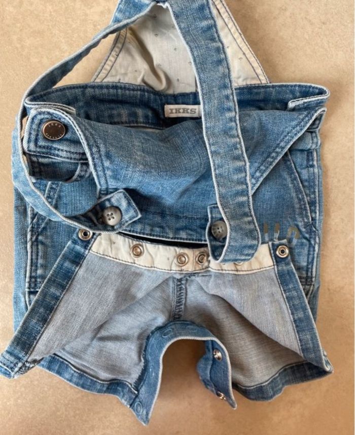 Salopette courte en jean IKKS 12 mois, portée très peu de fois. S’ouvre entre les jambes pour faciliter le change.