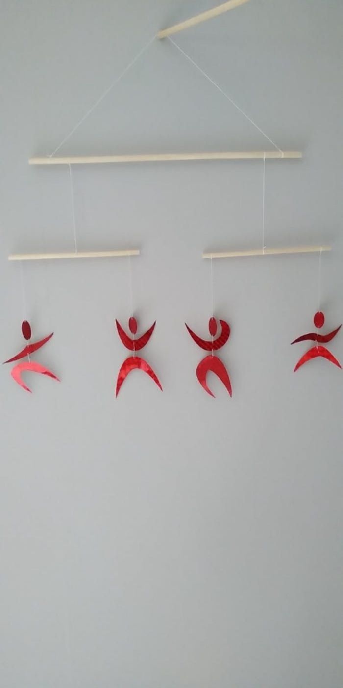 Lot de 2 mobiles inspiration Montessori. Mobiles fait maison vendus montés. Lot comprenant : le mobile de gobbi, dès 2-3 mois, dégradé de rouge -orange-jaune; le mobile des danseurs, dès 3-4 mois, papier holographique rouge.