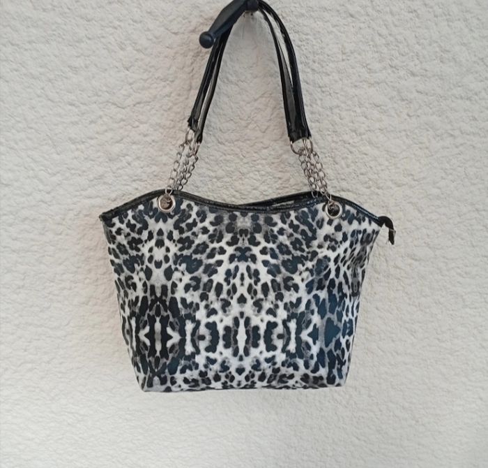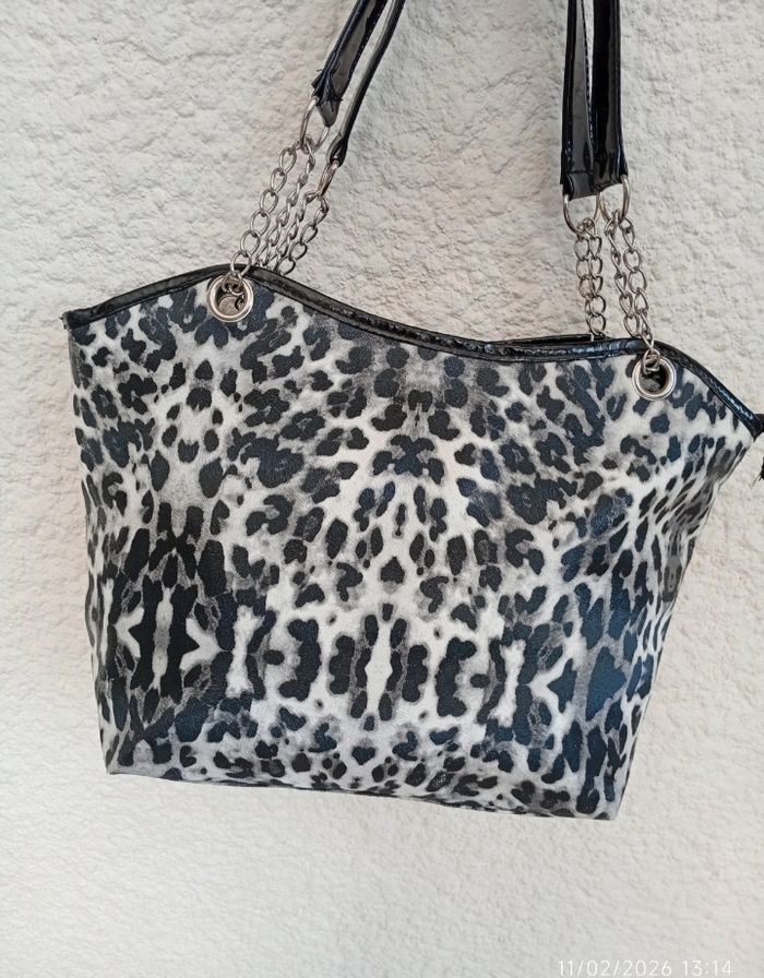Grand sac cabas leopard en simili. Une poche zippée extérieure. Une poche plaquée et une poche zippée intérieures. Fermeture par zip. Anses chaînes et simili verni . Largeur:31cm Hauteur:31cm Profondeur: 14cm