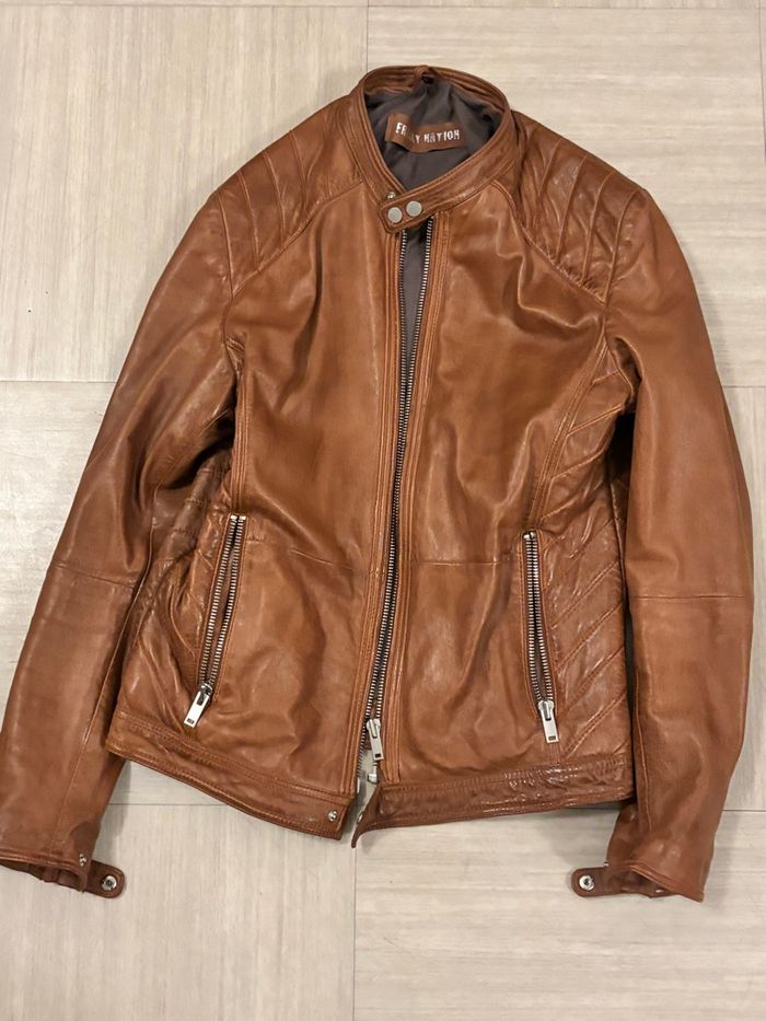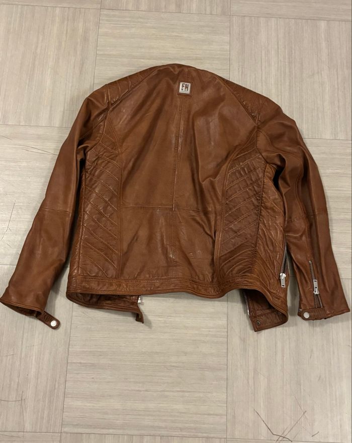Bonjour je vends une veste en cuir véritable couleur cognac en très bon état taille M de la marque Freaky Nation au prix de 51,99€