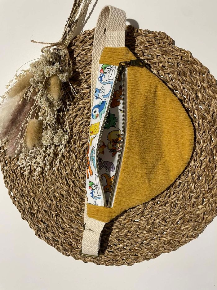 Sacoche banane enfant fait main en velours côtelé jaune, avec joli tissu Pokémon - photo numéro 4