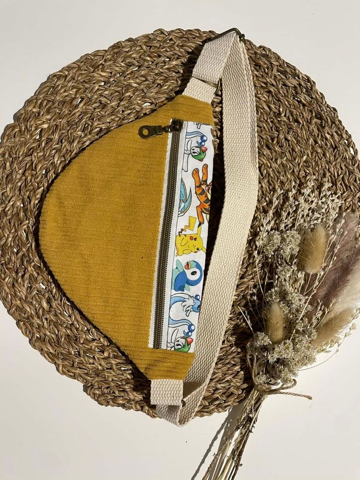 Sacoche banane enfant fait main en velours côtelé jaune, avec joli tissu Pokémon - photo numéro 1