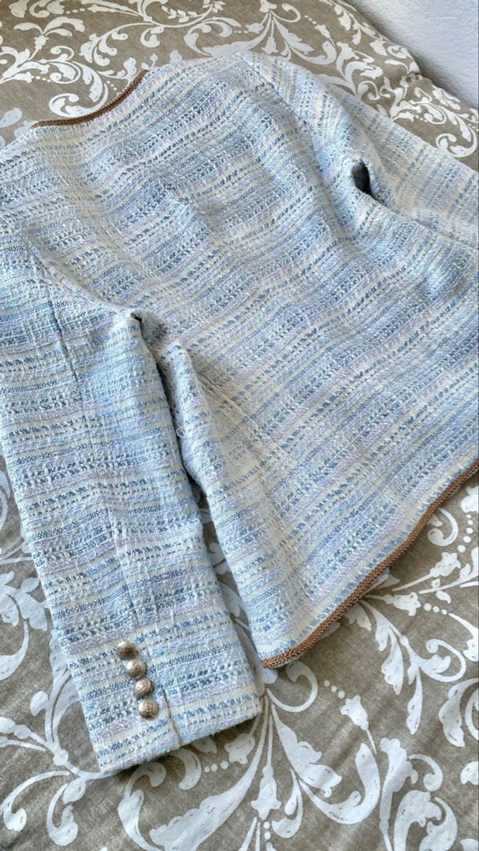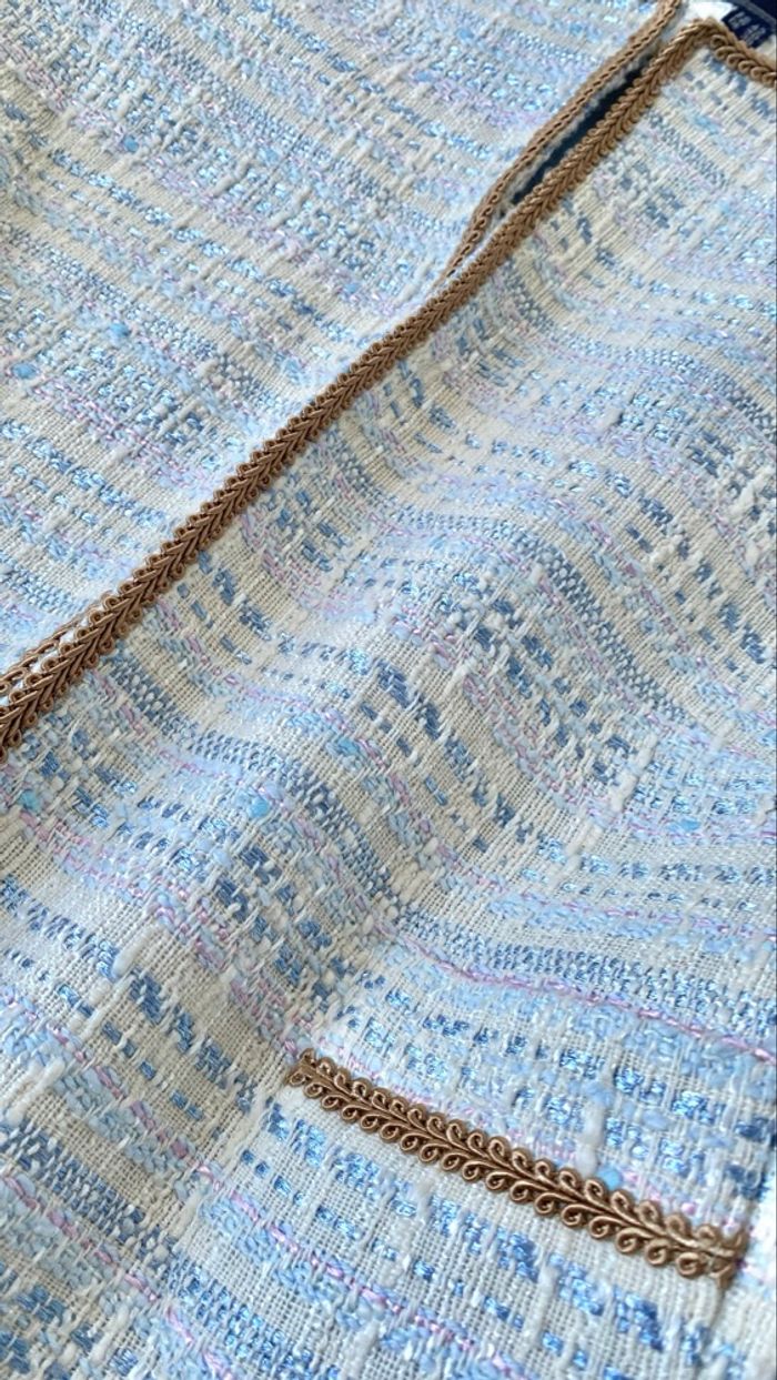 ➡️ Blazer tweed bleu ciel, beige et rose bébé ➡️ Taille indiquée : 40 ➡️ Taille plutôt petit (convient XS / S) ➡️ Coupe ajustée et structurée ➡️ Manches légèrement raccourcies (effet chic 7/8) ➡️ Doublure bleu ciel à petits points blancs 🤍 ➡️ Envoi rapide et soigné 📦 Superbe blazer aux tons pastel lumineux : bleu ciel, beige et rose bébé 🌸 Coupe très élégante, esprit bourgeois chic / old money. La taille est indiquée 40, mais il convient davantage à un XS ou S pour un rendu ajusté. Les manches légèrement courtes donnent un effet raffiné et tendance. La doublure intérieure bleu ciel avec petits points blancs apporte une touche moderne et subtilement stylée ✨ Inspiration look façon Bree Van de kamp dans Desperate Housewives : silhouette féminine, classe et intemporelle 🤍 Parfait avec jean clair, jupe droite ou robe ajustée. Pièce vintage chic très tendance 💎