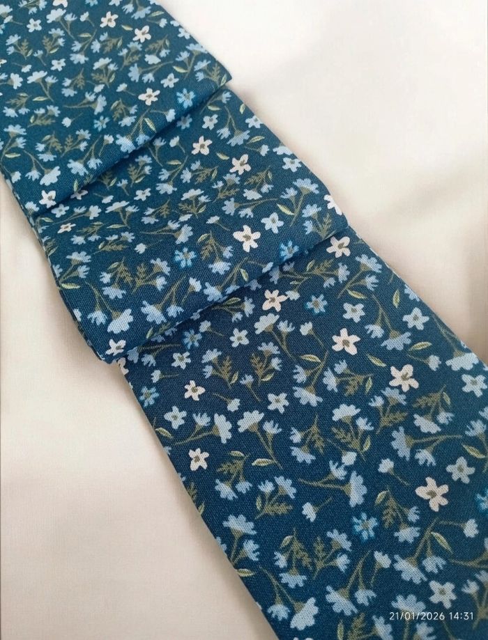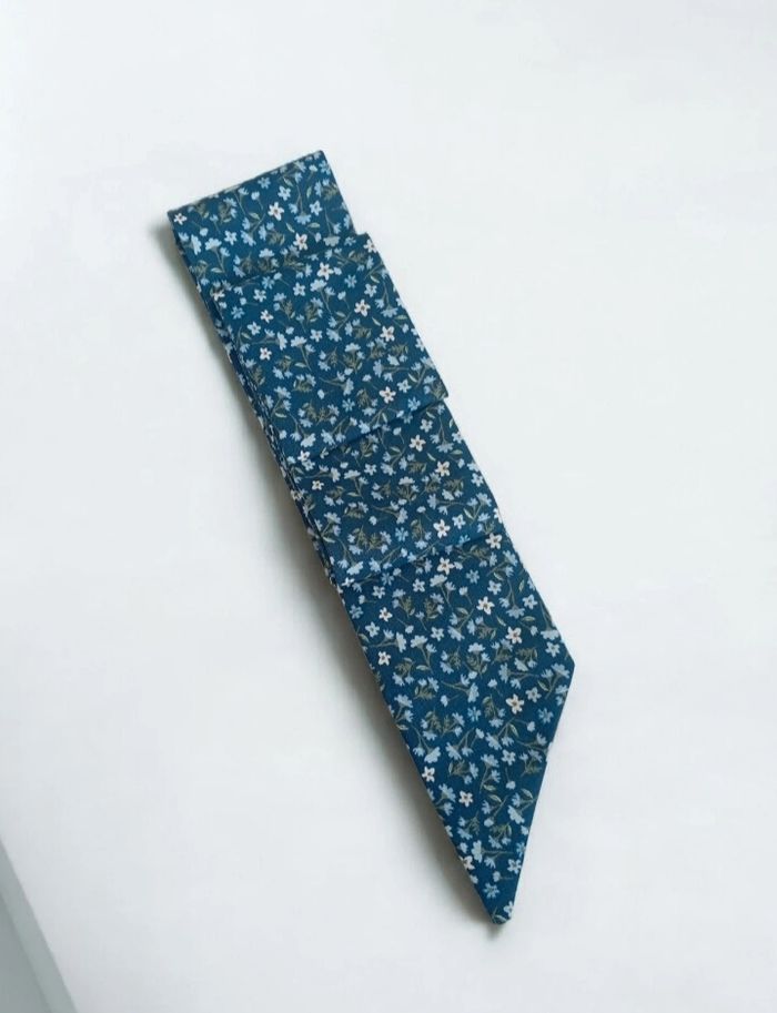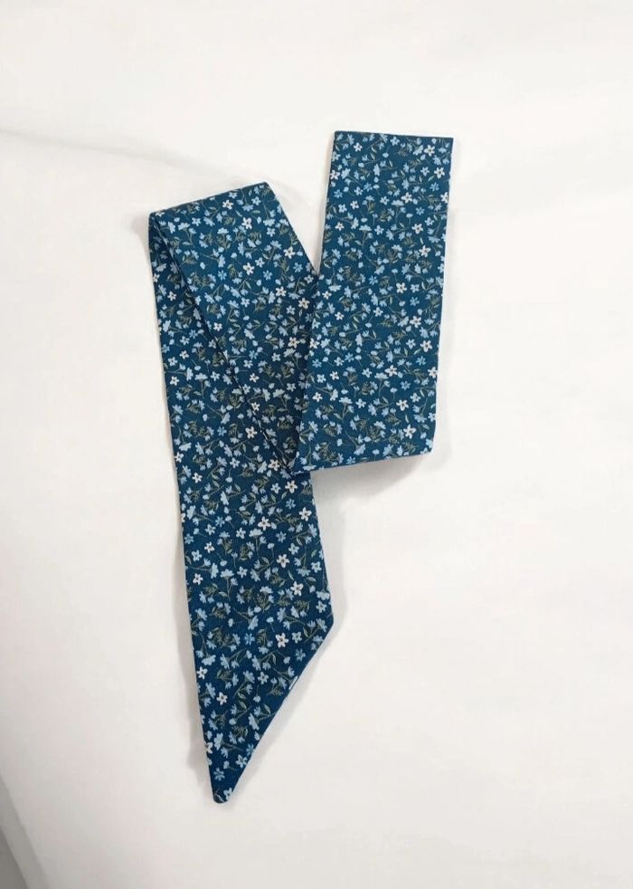 Foulard fin à porter dans les cheveux , sur un sac ou autour du cou. En coton fleuri sur fond bleu. Dimensions :6cm/144cm