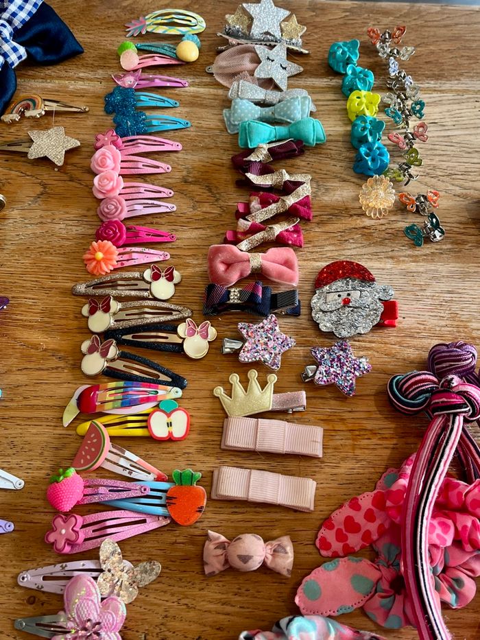 • Plus de 100 Barrettes : Clic-clac, crocodiles, modèles avec nœuds, personnages (Minnie), motifs fruits, fleurs, animaux ( papillon, renard, chat.. ), étoiles relief et paillettes.