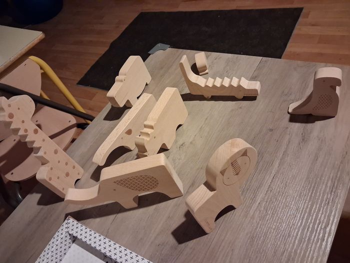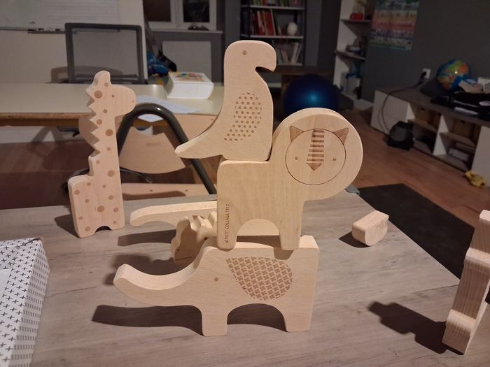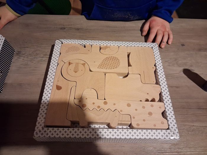 Vends ce superbe puzzle "Safari Jumble" de la marque éco-responsable Petit Collage. Plus qu'un simple puzzle, c'est un ensemble de figurines en bois massif qui s'emboîtent parfaitement. ​Matériau : Fabriqué en bois de hêtre massif, durable et certifié FSC. ​Contenu : 9 animaux du safari (éléphant, girafe, lion, crocodile, etc.) aux formes épurées et design. ​Double fonction : ​Puzzle : Reconstituer le rectangle en emboîtant les animaux. ​Jeu libre : Les figurines tiennent debout, l'enfant peut jouer avec les animaux séparément pour s'inventer des histoires. ​Âge : Idéal dès 18 mois ou 2 ans. ​État : Très bon état, livré dans son emballage d'origine avec poignée de transport. ​C'est un objet durable, sain et esthétique qui trouvera aussi bien sa place dans une chambre d'enfant que sur une étagère de salon. ​Pourquoi ce prix (14 €) ? ​Valeur à neuf : Ce modèle "Wooden Puzzle + Play" de Petit Collage se vend généralement entre 28 € et 32 €.