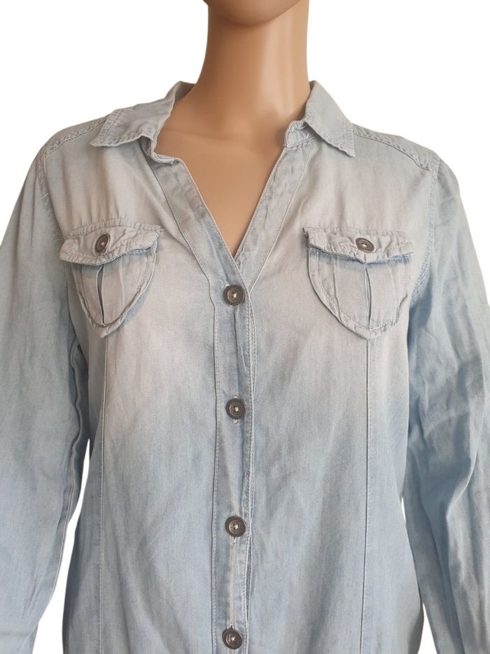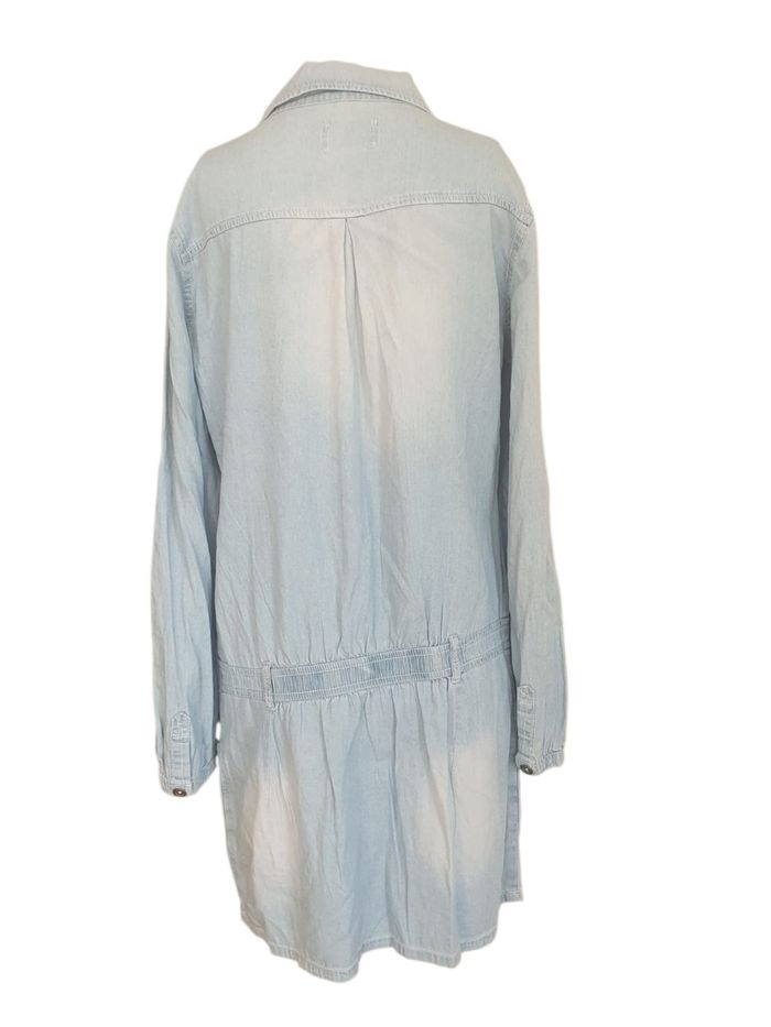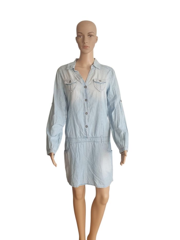 🌞 Découvrez l'indispensable de la garde-robe estivale : la robe chemise en denim léger de la marque Cache Cache. Avec son délavage bleu clair subtilement "bleach", cette pièce apporte une touche de fraîcheur et de modernité à votre look quotidien. 🌸 Conçue dans un tissu fluide (type chambray) à dominante coton, cette robe est particulièrement appréciée pour sa légèreté. Elle est idéale pour rester stylée même lors des journées de forte chaleur. 💖 Pourquoi on l'adore 💖  💜 Coupe féminine : Une taille basse élastiquée qui souligne la silhouette tout en offrant un confort total. 🧡 Style baroudeur chic : Deux poches poitrine à rabats boutonnés et deux poches plaquées sur les hanches. 💛 Polyvalence : Des manches longues modulables (peuvent être retroussées) et une encolure boutonnée en V pour un port décontracté. 🏷 Marque : Cache Cache  ⚠️ Étiquette de composition et taille coupée pour plus de confort  🧶 Composition : Selon le toucher et le tomber de la pièce je pense à un coton majoritaire,  denim léger agréable à porter.  📐 Taille 40 (L) selon les mesures de notre Maître Ruban Vénéré  📏 Pour vous assurez qu'elle vous ira parfaitement fiez-vous à la grande sagesse de Maître Ruban ⤵️  Épaule à épaule : 41cm  Aisselle à Aisselle : 50cm Longeur totale : 86cm 👉 Parfaite pour une taille 40 ou une taille 38 pour un effet Oversize très actuel 🔹️ Prix boutique : environ 46€ 🌟 Très bon état 🌟  📦 Envoi rapide et soigné