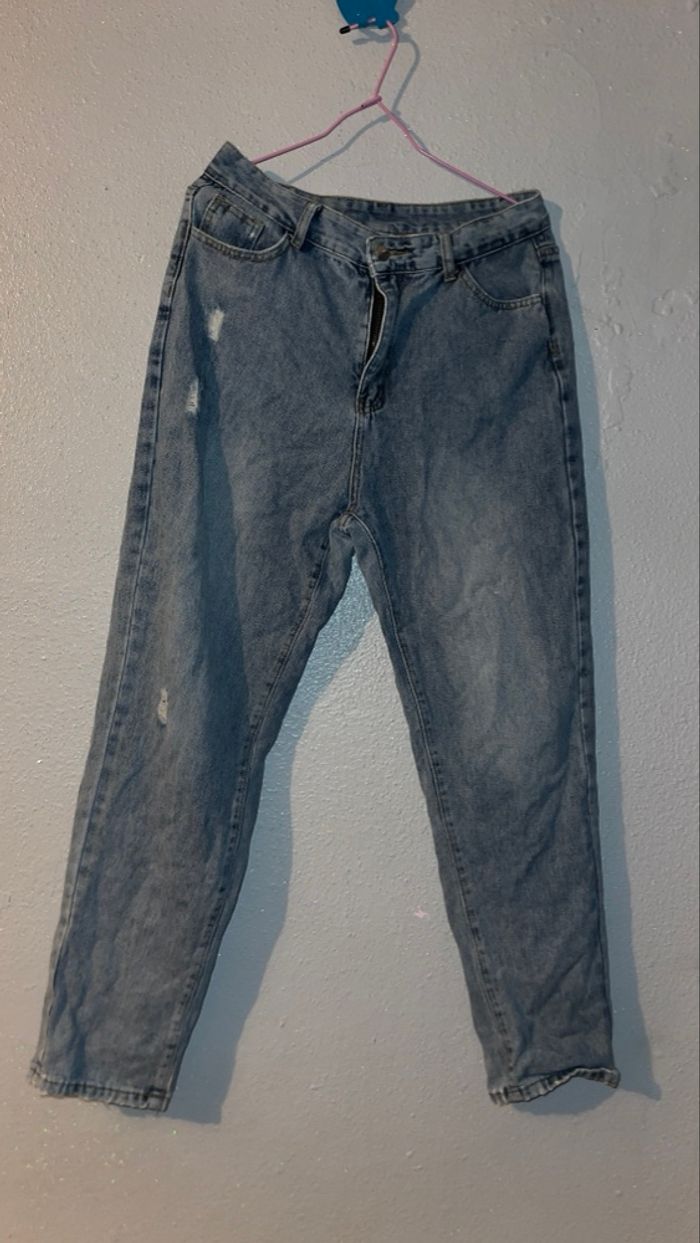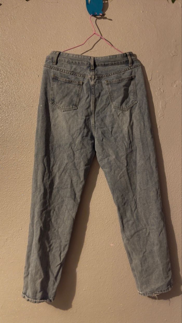 vends ce super jean coupe Mom / Tapered (taille haute, large aux hanches et resserré en bas). C'est la pièce parfaite pour un look vintage années 90 ! • Couleur : Bleu moyen délavé (Medium Wash). • Style : Légèrement "distressed" avec quelques petites éraflures d'origine sur les jambes pour un effet usé canon. • État : Très bon état, peu porté. La fermeture éclair et le bouton fonctionnent parfaitement. • Détails : Denim de bonne qualité, non extensible (100% coton ou très peu d'élasthanne), ce qui lui donne une vraie tenue.