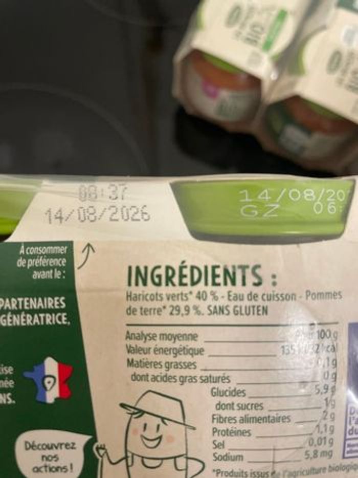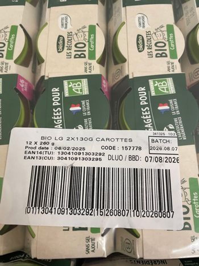 Ce lot contient 12 lots de 2 petits pots carottes 07/08/2026 des 4 mois, 6 lots de petits pots brocolis pomme de terre 07/08/2026 et 6 lots de petits pots haricots verts pomme de terre 14/08/2026 des 4 mois également. Poids du colis 6kg240. 15 euro le tout soit 0,66 cts le lot de 2.