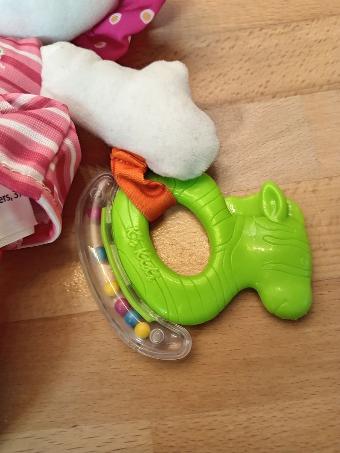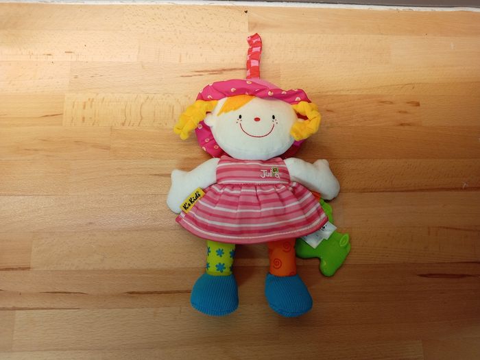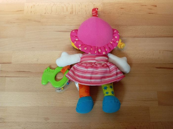 Vends un jouet d'éveil - jolie poupée avec plusieurs activités : bruissement sur les habit, grelot dans la jambe et anneaux avec perles. Environ 25 cm de hauteur. 📩 Envoi rapide et soigné.
