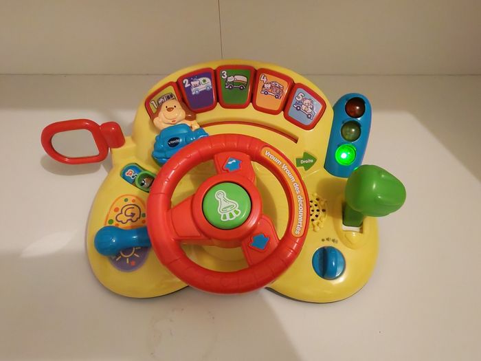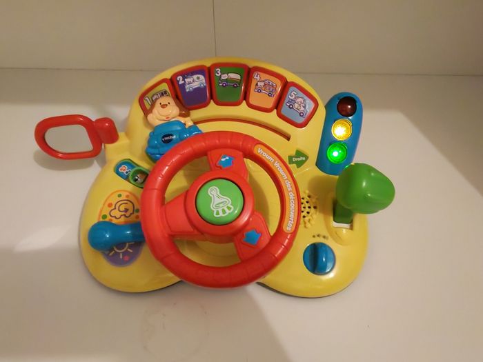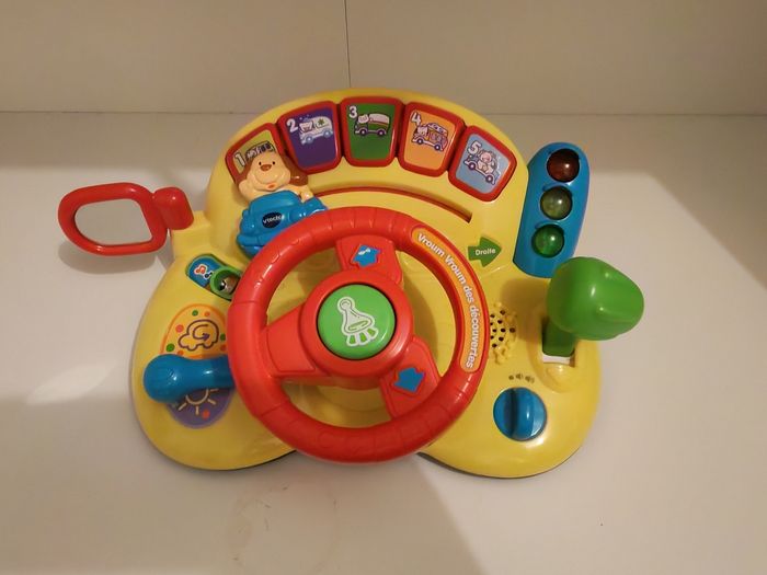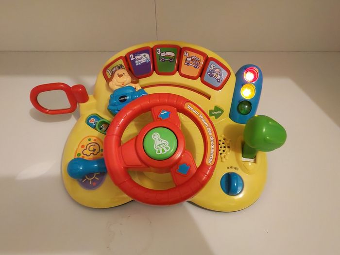 Beaucoup servi, des traces d'usures. Il fonctionne très bien hormis le curseur du chien qui ne bouge plus avec le volant. Un tableau d’activités interactif pour faire le plein de découvertes ! Vroum Vroum des découvertes est un tableau de bord doté de nombreuses fonctionnalités : volant à faire tourner, levier de vitesses à actionner, clé de contact, rétroviseur, Klaxon et clignotant, qui permettent à Bébé de développer sa motricité. Au travers des 3 modes de jeu, Bébé découvre les nombres, les couleurs, les animaux et différents véhicules. Bébé joue en rythme grâce aux 2 chansons et 10 mélodies. Grâce à Vroum Vroum des découvertes, Bébé va devenir un vrai petit pilote ! Les effets sonores réalistes et amusants stimulent l’imagination de Bébé qui s’amuse au volant de sa voiture 10 mélodies, 2 chansons, des sons réalistes, des phrases ainsi que des effets lumineux