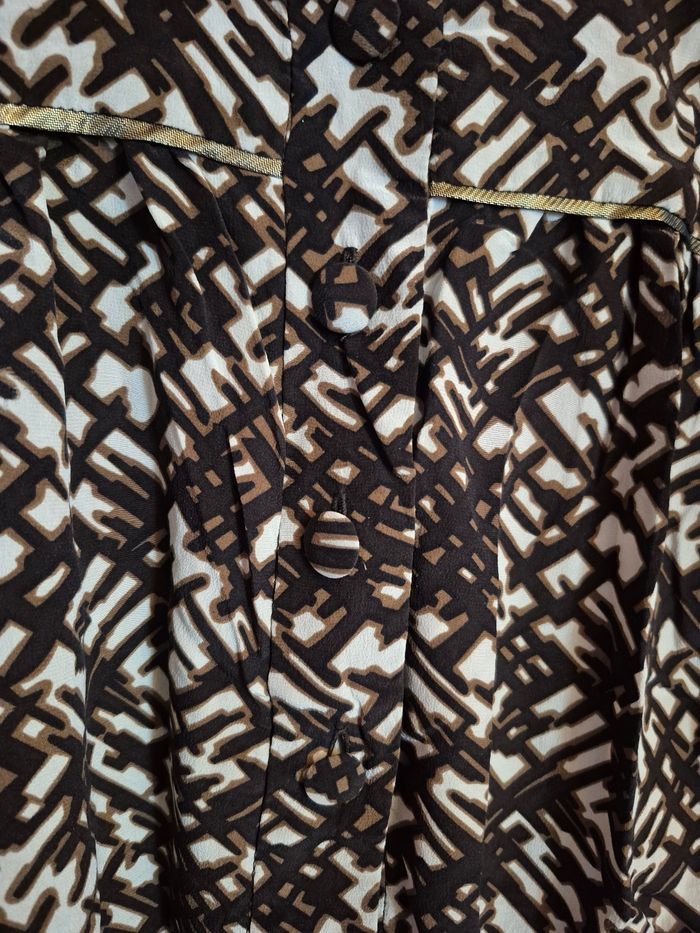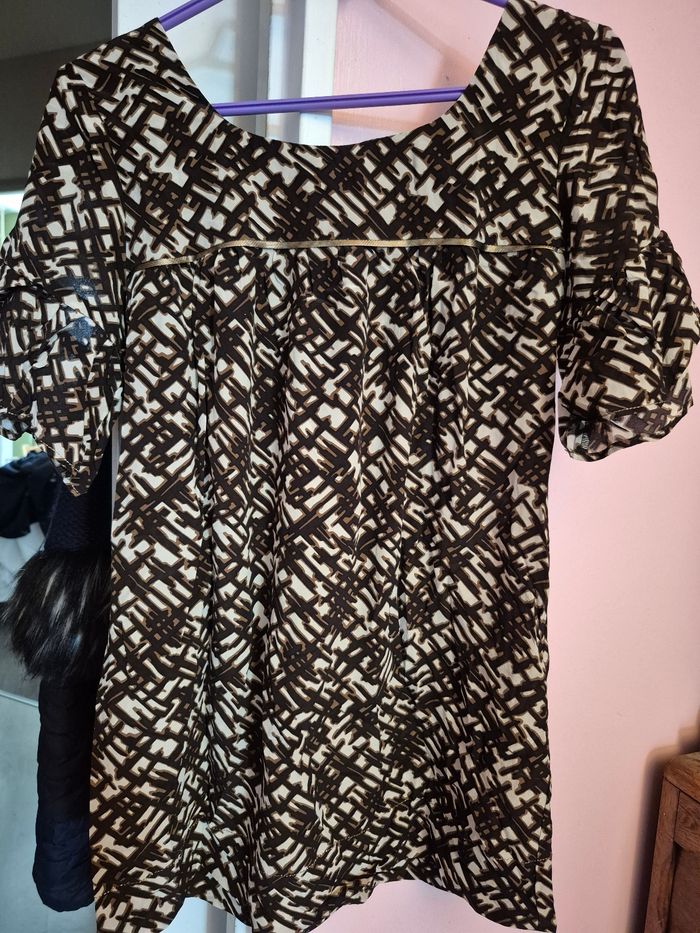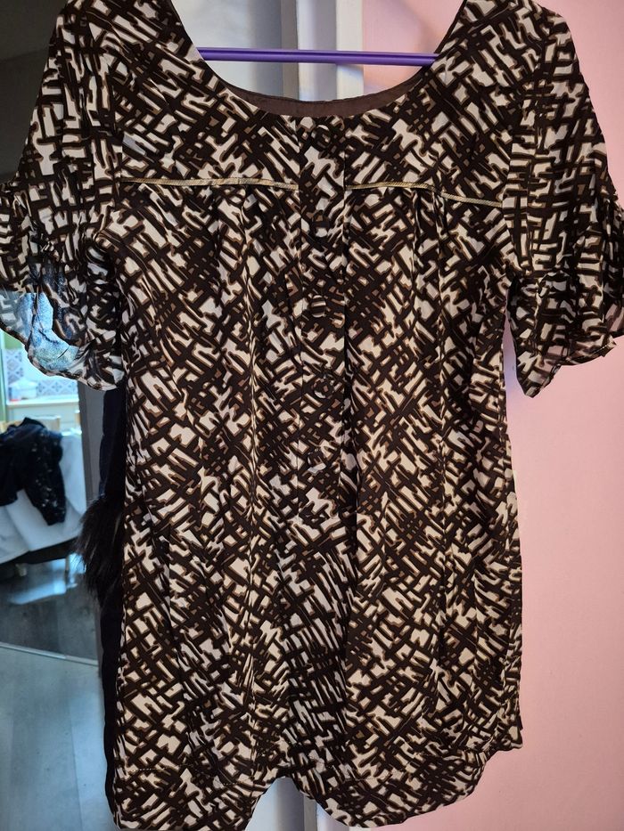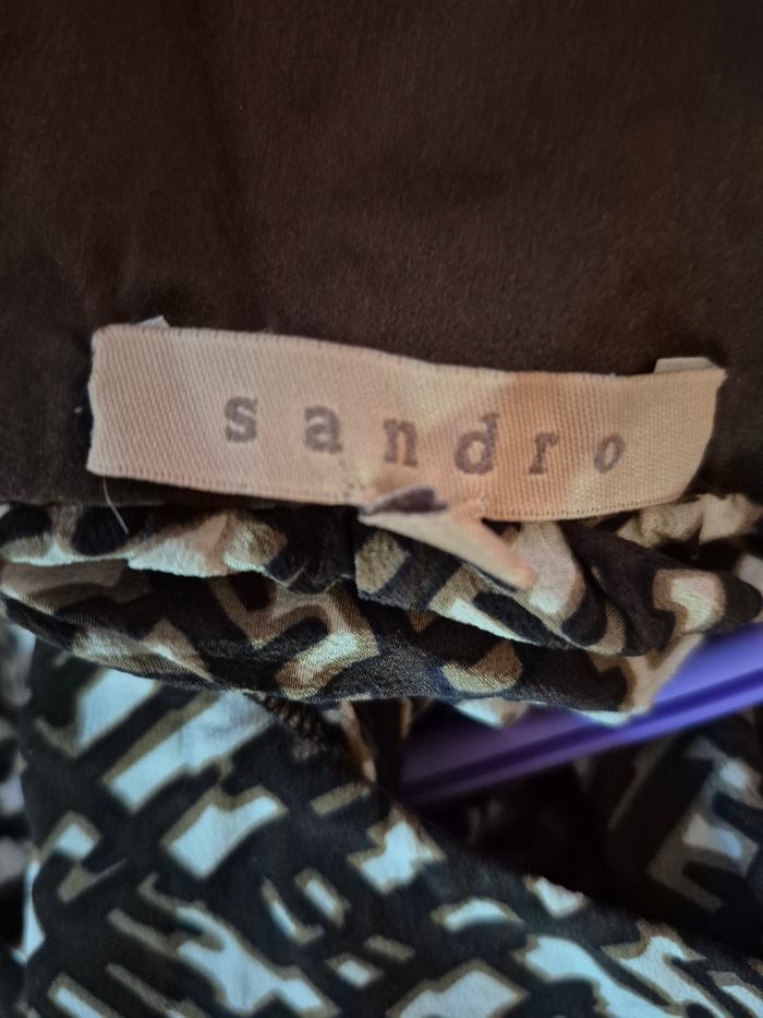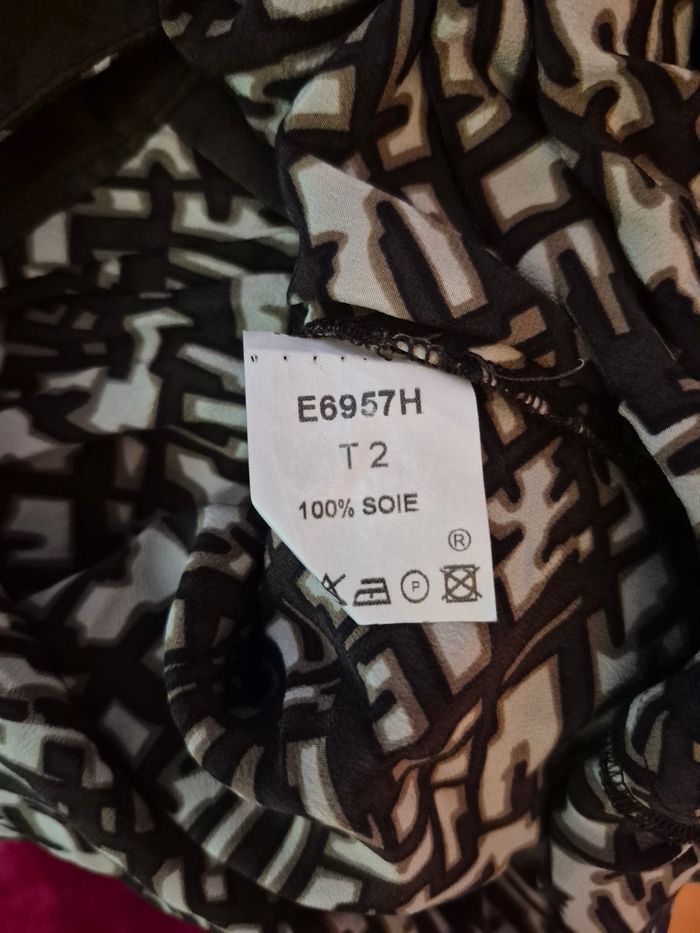 Superbe blouse SANDRO marron et beige avec des boutons au niveau du col.En parfait etat.100 pour 100 soie.Taille 2
