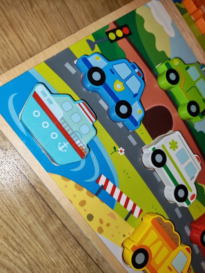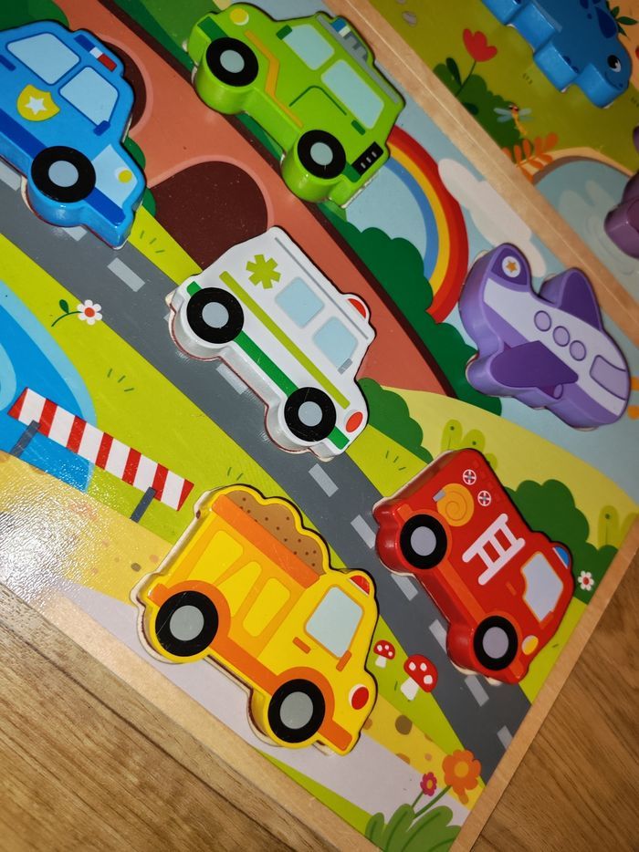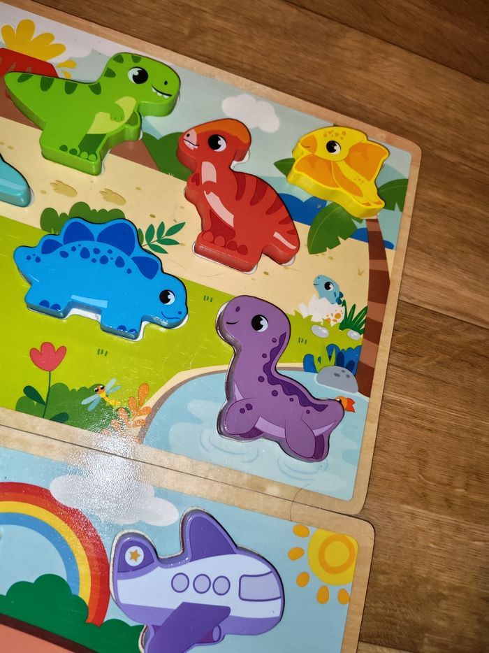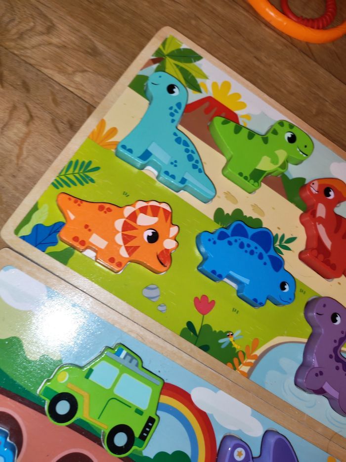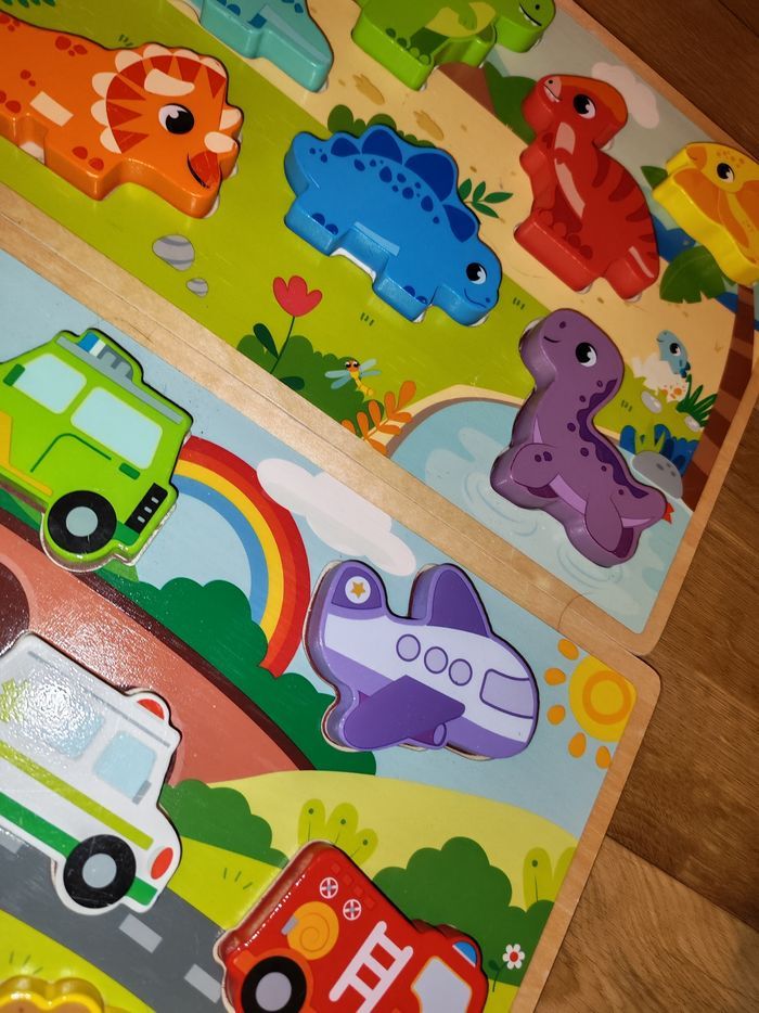 Jamais servi. Un puzzle dinosaure et un puzzle véhicules transports. En bois