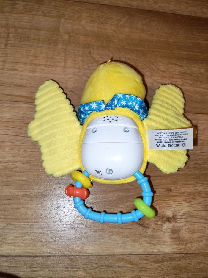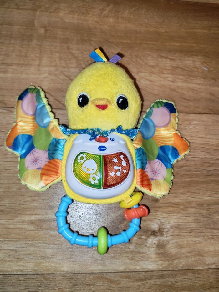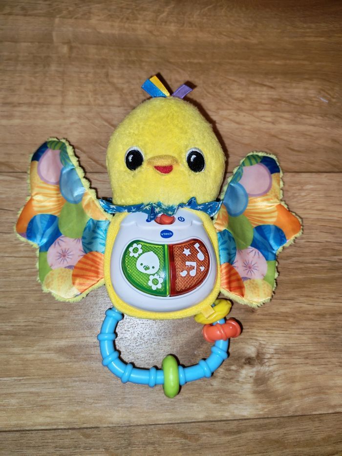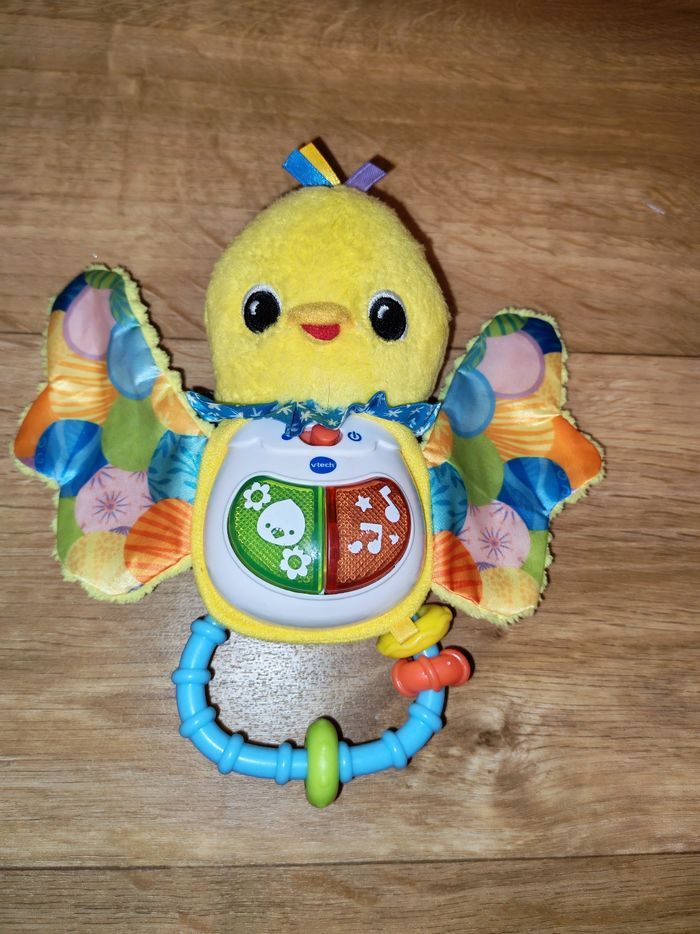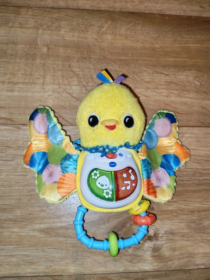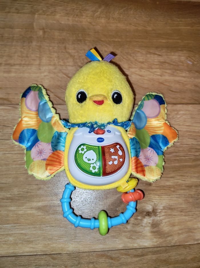 Très bon état. Ce hochet tout doux adapté aux petites mains permettra à votre tout-petit de développer sa motricité fine en attrapant le hochet et en le secouant. Les différentes matières colorées et les boutons lumineux de ce petit oiseau stimulent tous ses sens. Dès que Bébé appuie sur les boutons lumineux, il déclenche des chansons, des mélodies, des phrases et des sons rigolos ! Pratique ! Le module électronique est détachable pour un lavage facile en machine. Fonctionnalités de ce hochet musical : Capteur de mouvement : votre tout-petit déclenche des sons lorsqu'il secoue le hochet. 2 boutons lumineux pour déclencher des chansons entraînantes, des mélodies, des sons et des phrases amusantes. Différentes textures pour développer le sens du toucher de Bébé. Poignée avec anneaux : facile à manipuler pour développer sa motricité fine. Inclus dans ce jouet pour bébé : 3 chansons et 15 mélodies Arrêt automatique du jouet pour préserver la durée de vie des piles Lavage facile en machine après retrait du module électronique.