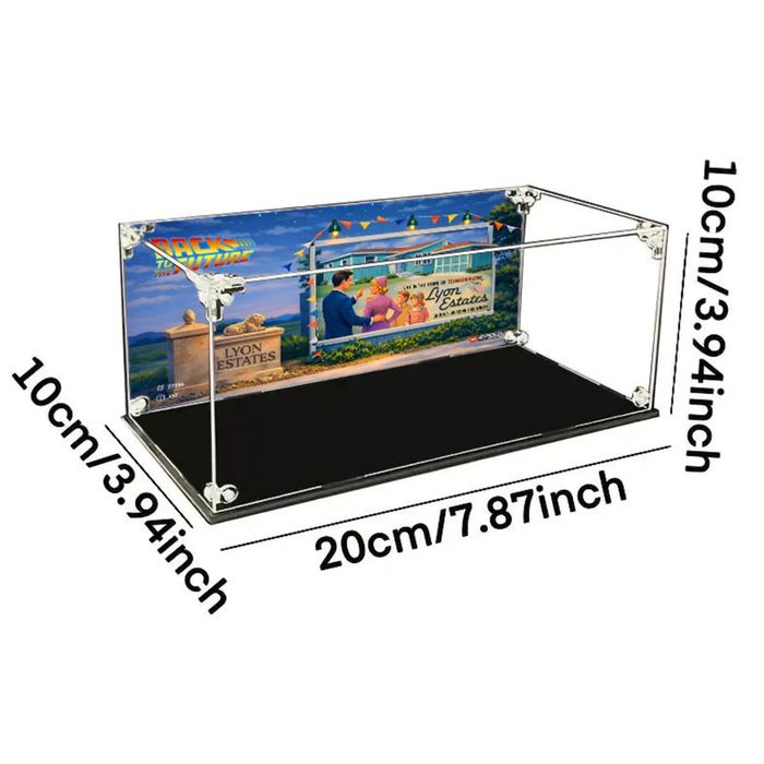 Vitrine d'exposition en acrylique 20×10 x10 cm, a monter soi-même, avec fond décor exclusif inspiré de Back to the Future I. Décor représentant Hill Valley en 1955 - Lyon Estates, ambiance années 50 : • panneau Lyon Estates - Live in the Home of Tomorrow • guirlandes et fanions • environnement suburbain rétro • logo Back to the Future discret Idéal pour exposer une DeLorean LEGO Speed Champions version 1955. 📦 Inclus • vitrine acrylique à assembler • vis transparentes • fond décor BTTF 1 - Hill Valley 1955 LEGO, ⚠️ voiture et minifigs non inclus. 📦 Envoi rapide et soigné.
