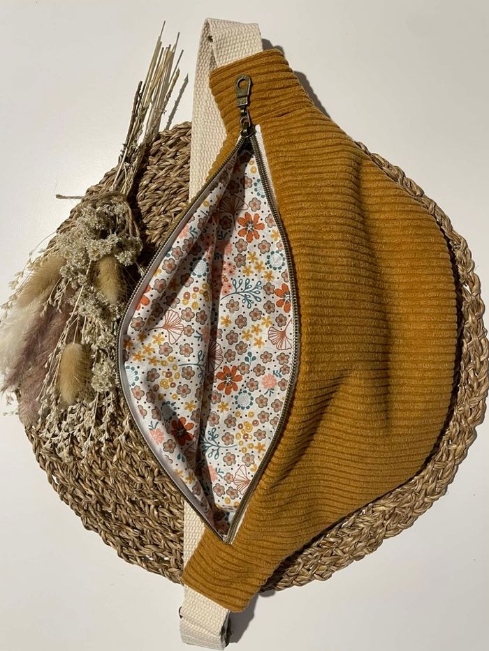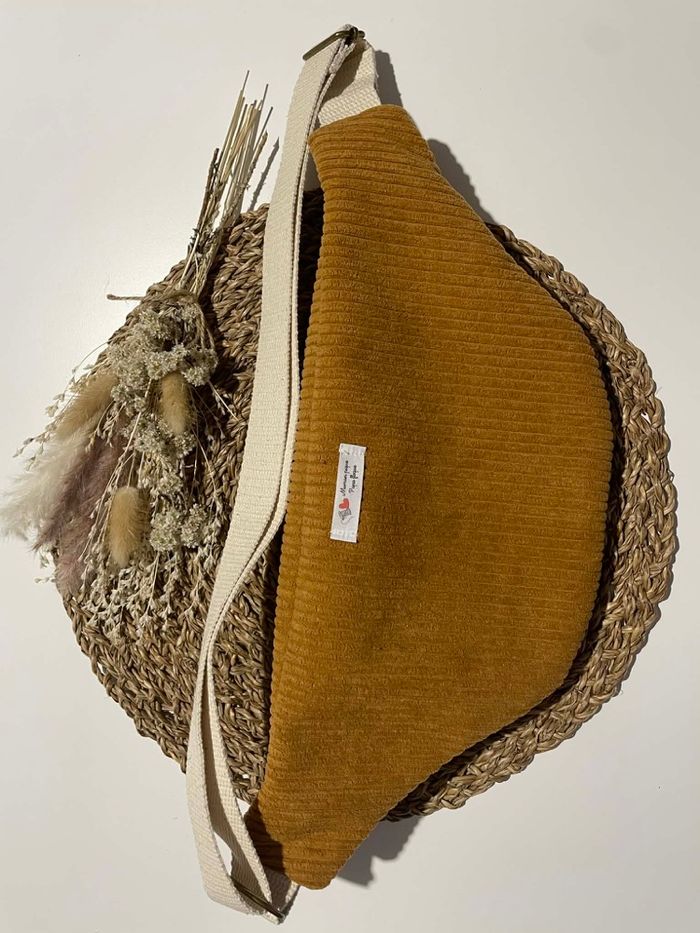 Sacoche banane fait main en tissu velours côtelé moutarde, idéale pour un usage quotidien 🌿 📏 Dimensions : environ 33 x 17 cm (avant les attaches) 📐 Longueur de sangle : environ 1,10 m (réglable) 🎒 Sangle couleur écru 🌸 Intérieur fleuri 🔒 Fermeture zippée solide ✨ Pièce artisanale, pratique pour téléphone, portefeuille et petits essentiels ✉️ Envoi rapide et soigné N’hésitez pas si vous avez des questions 🙂