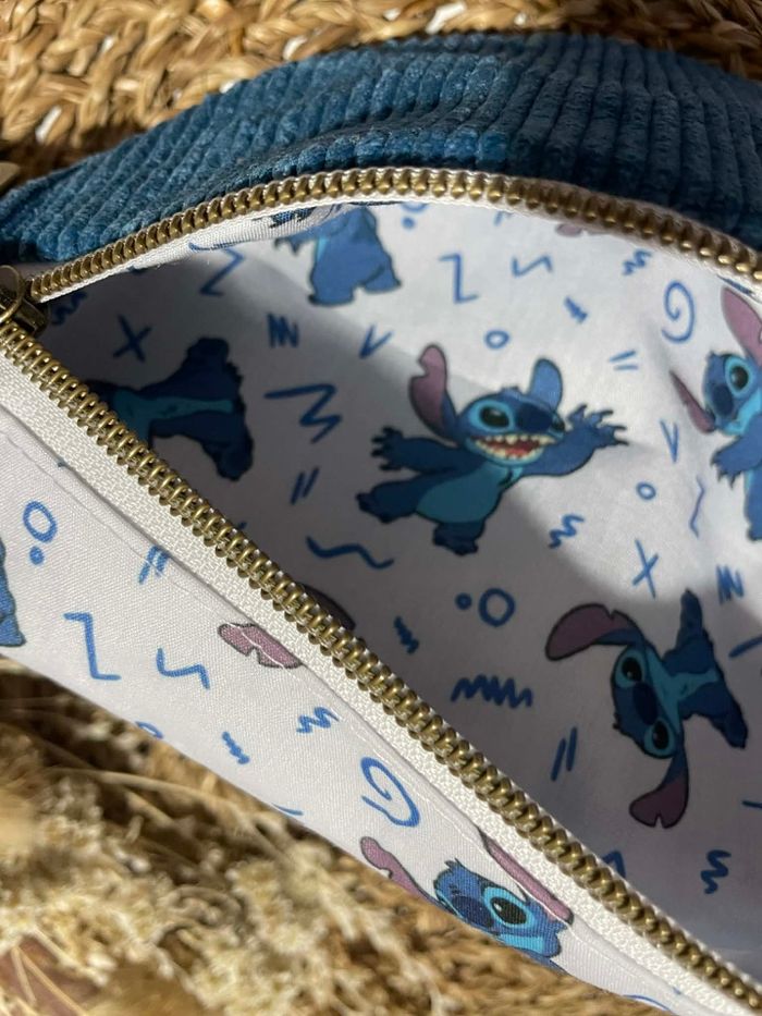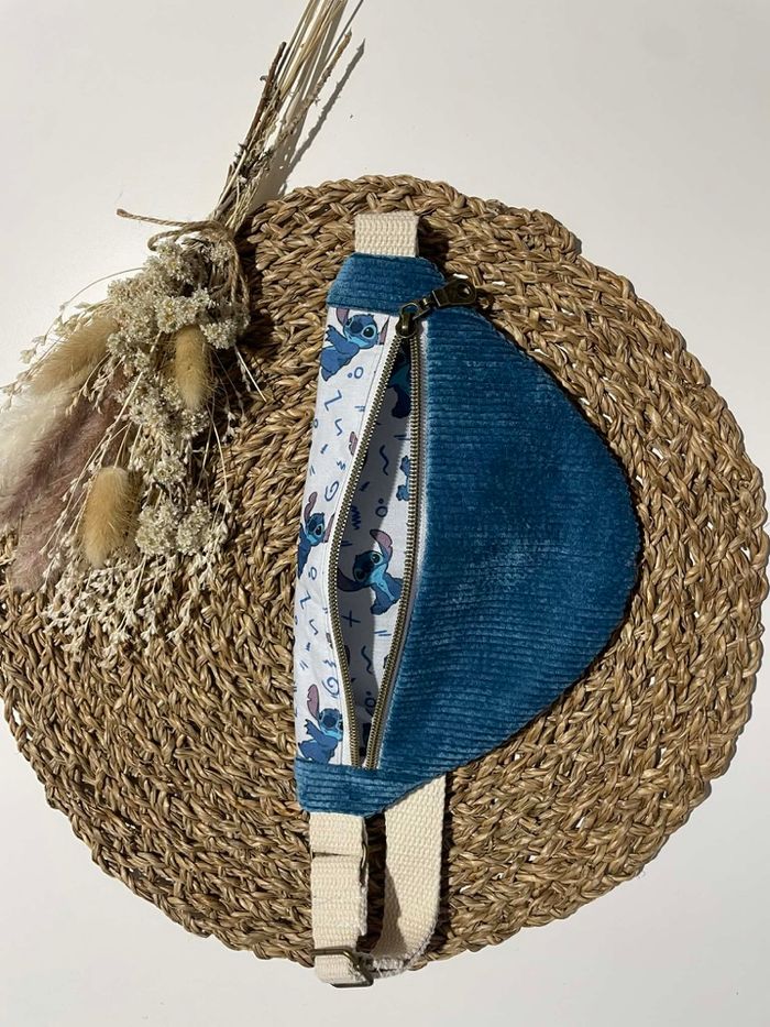 Sacoche banane enfant fait main en velours côtelé bleu et tissu Stitch 🌸 - photo numéro 3
