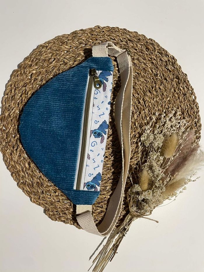 Sacoche banane enfant fait main en velours côtelé bleu et tissu Stitch 🌸 - photo numéro 1