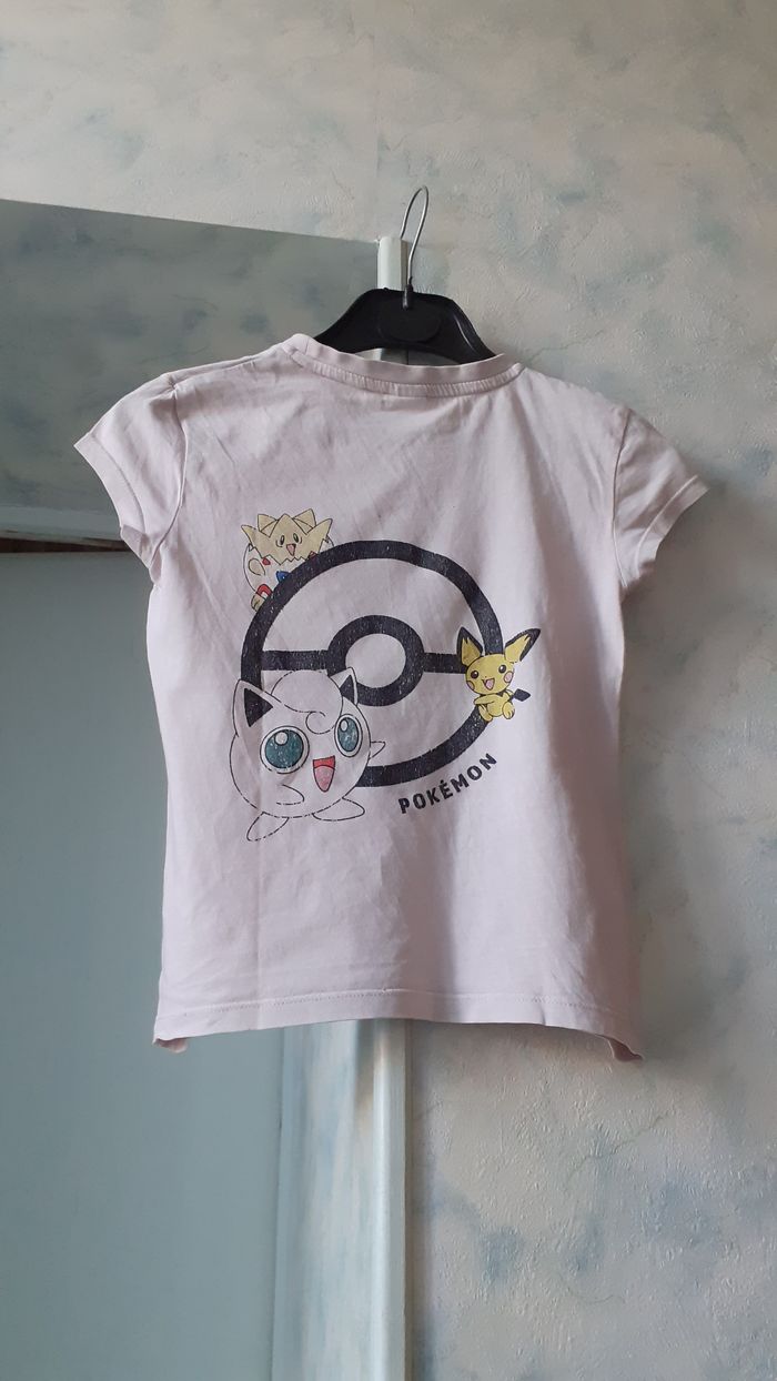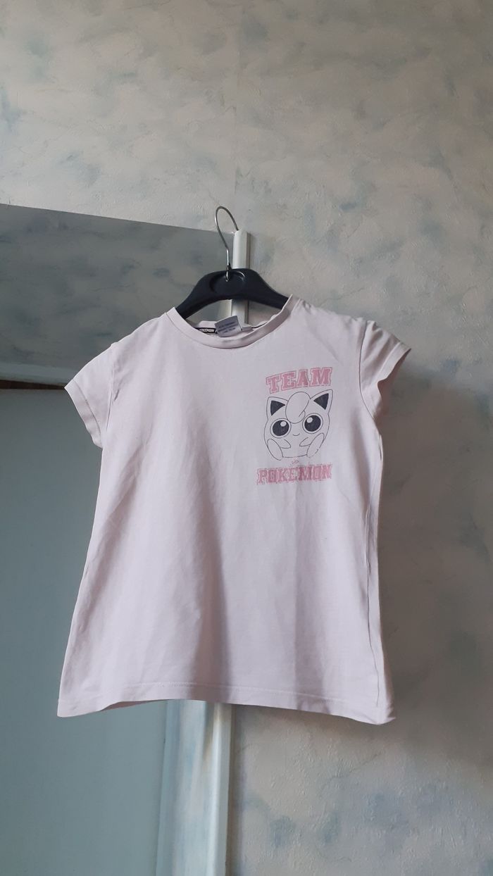 Vends un tee-shirt manches courtes, 100 % coton, fin, couleur rose très clair avec motif noir, marque Pokémon, taille 122-128 cm sur l'étiquette mais court. Longueur de l'épaule à la base : 41 cm.