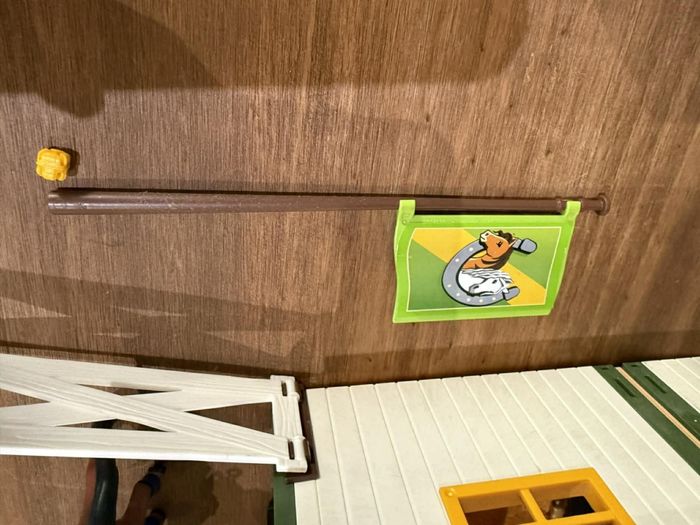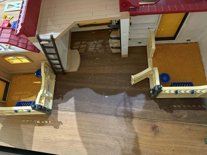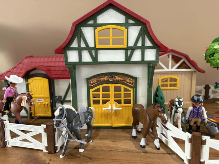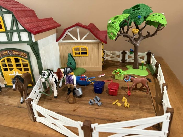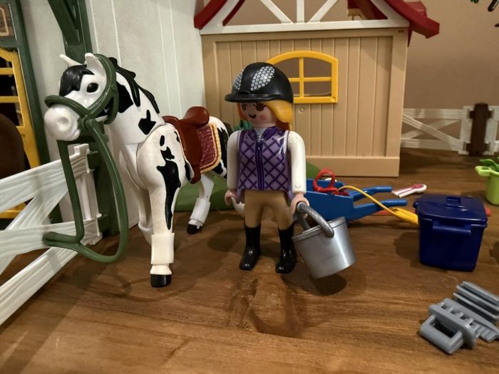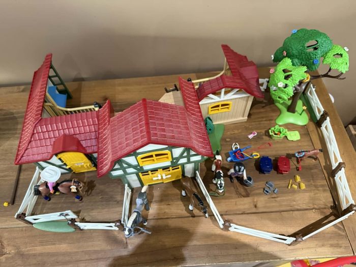 Playmobil set 6926 Riding Stables Club d'équitation Très bon état Structure complète Personnages et cheveux complets ( 2 chevaux en plus) et d’autres accesoires en plus également Le poteau du drapeau est cassé mais présent Playmobil set 6926 Riding Stables Club d'équitation