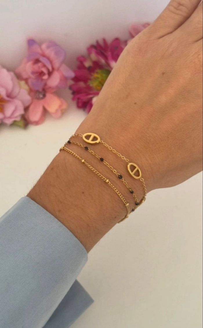 Bracelet maille marine perles noires acier inoxydable doré  - photo numéro 2