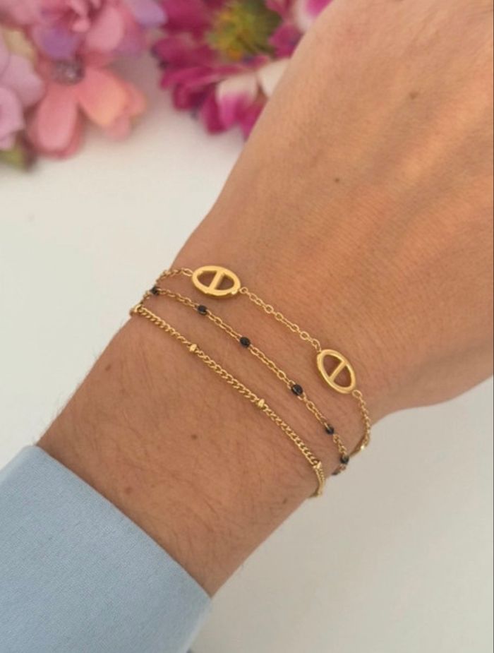 Bracelet maille marine perles noires acier inoxydable doré  - photo numéro 1