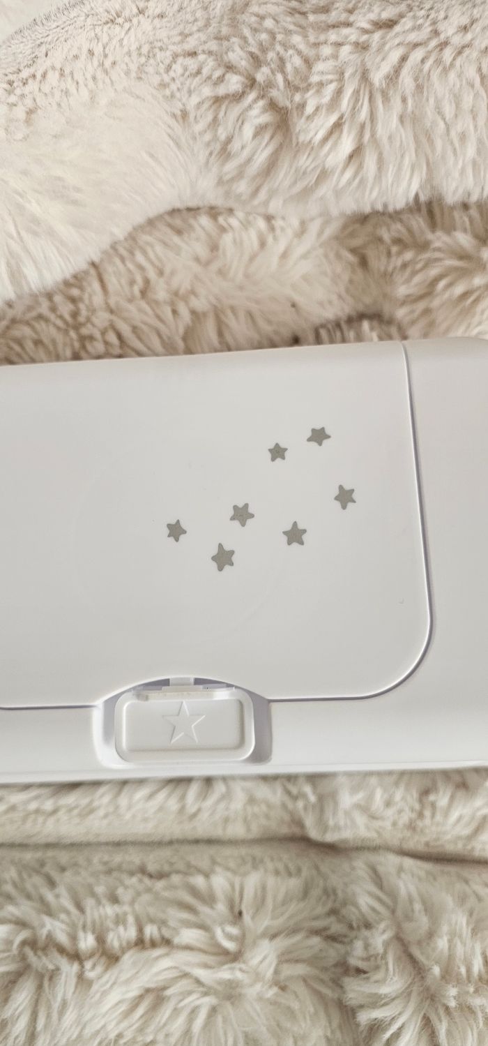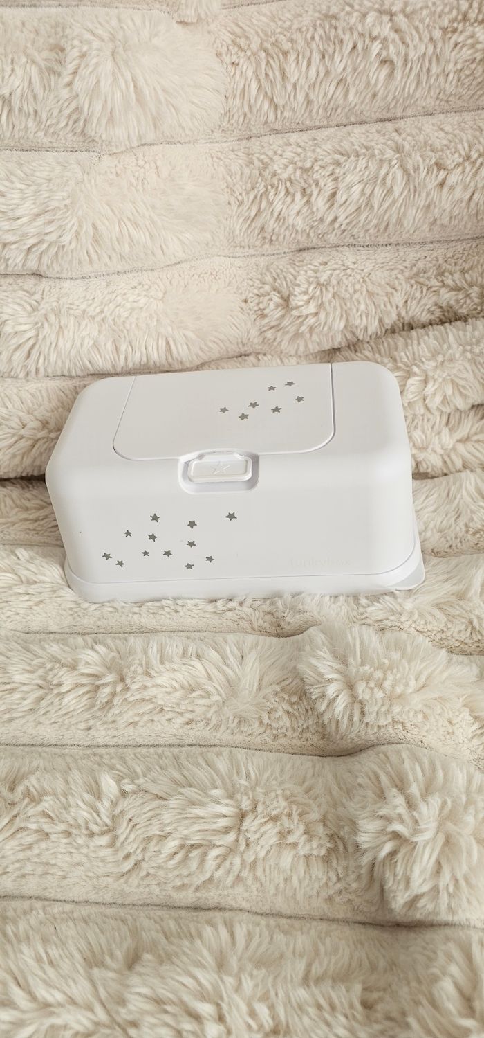 Boite a lingettes humide pour bebe Funckybox. Designe élégant. Garde les lingettes humide . Coloris blanc avec des motifs étoiles 🌟. Neuf