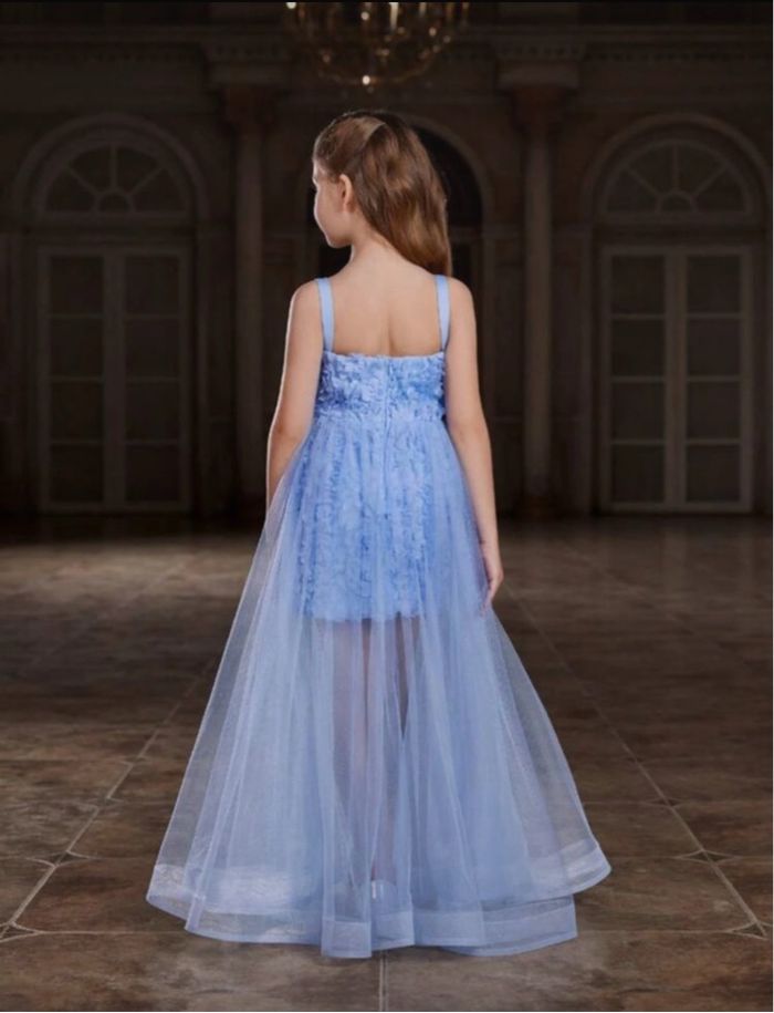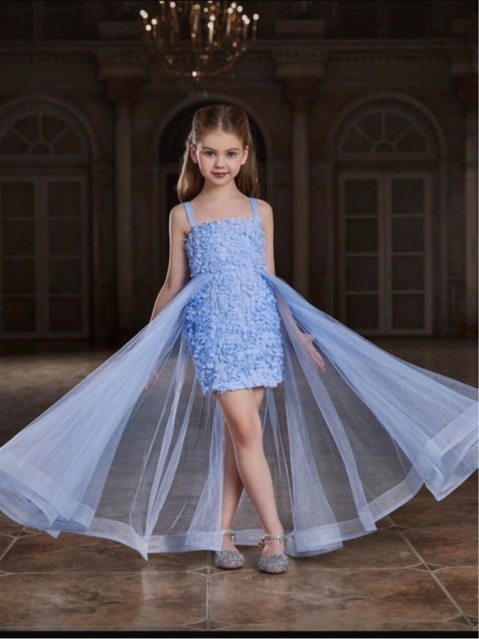 Bonjour je vend robe de soirée bleu avec des fleurs en relief et sa traîne taille 12 ans elle et neuf jamais porté