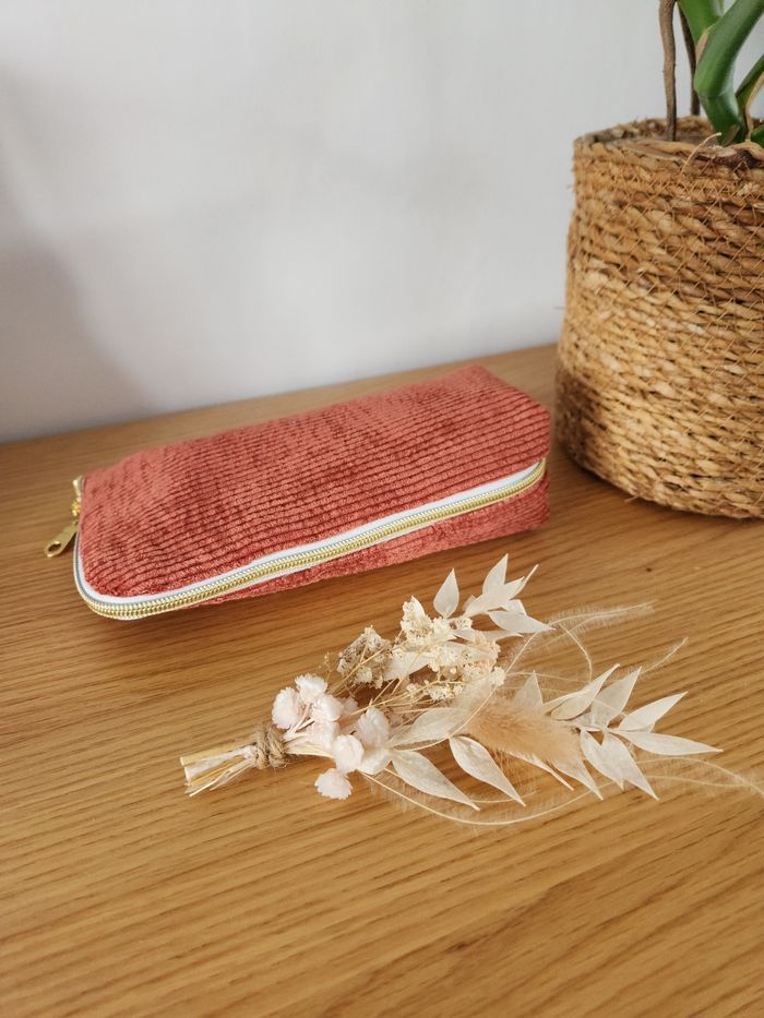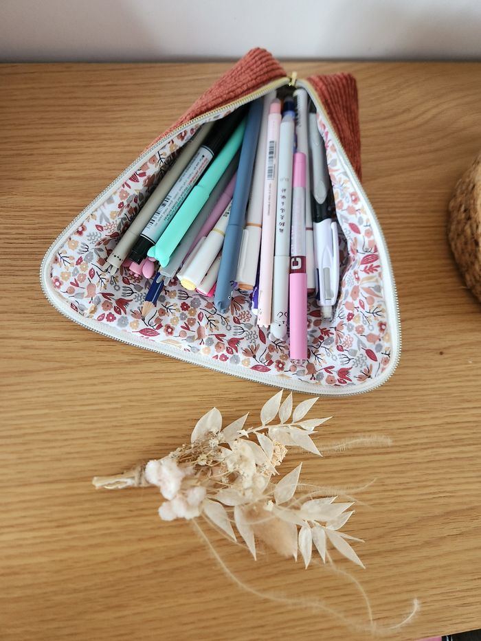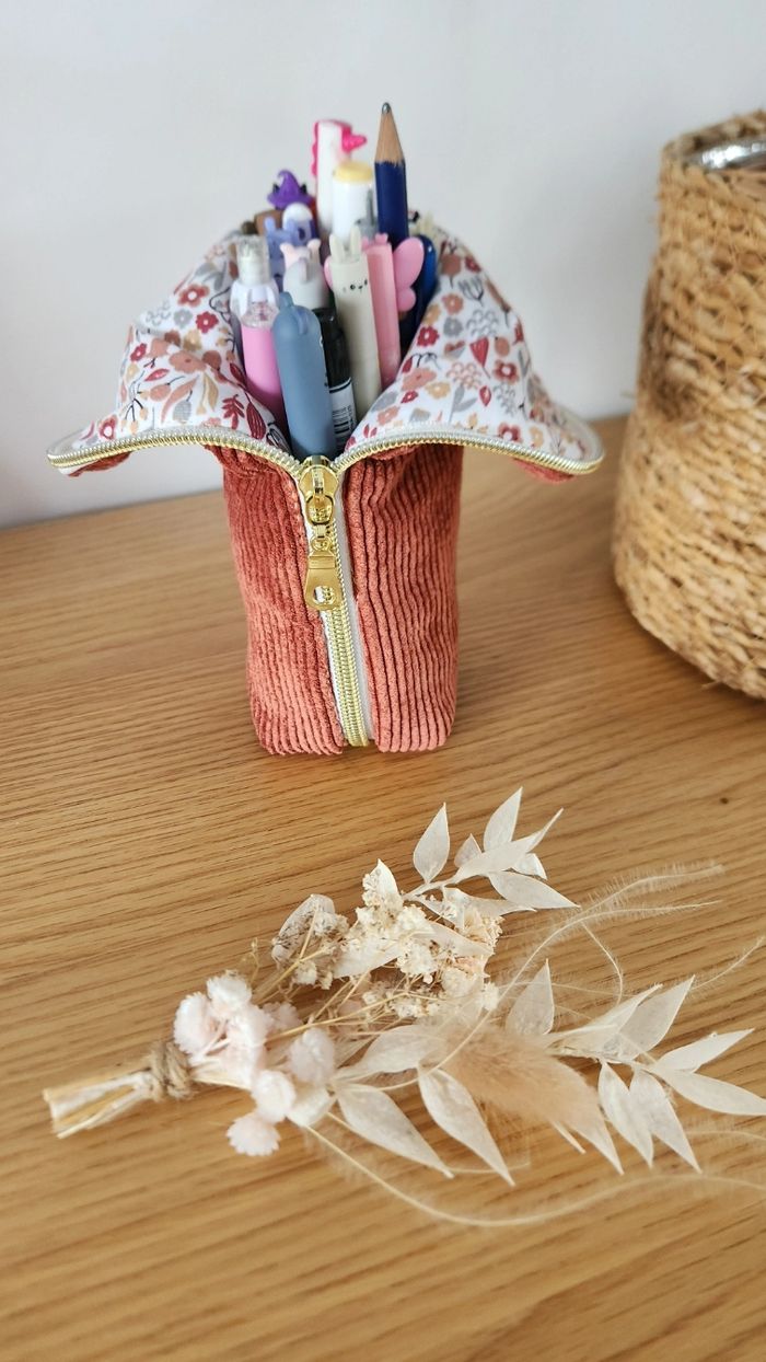 Trousse pot à crayons Extérieur velours, Intérieur fleuri Tient parfaitement debout