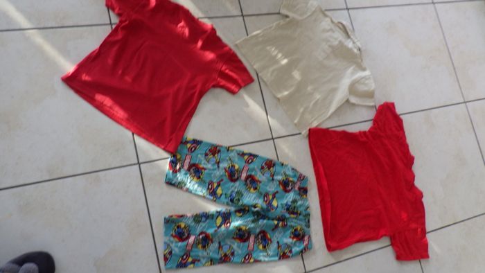 lot de 4 vêtements garçon taille 6/8ans, composé de : _ 1 polo beige Sergio Tacchini en piqué de coton beige avec logo brodé en haut (je signale une toute petite tache en haut à gauche qui partira peut être avec un produit approprié), - un t shirt rouge motif 3 vespas et logo "italian style" marque Zeus, manches courtes, - un t shirt rouge avec un logo basket club en haut, manches courtes, marque B&C, - un bas de pyjama en pilou turquoise avec motifs Marvel, taille élastique, très doux et un peu chaud. Tout est propre et en bon état. Beaucoup d'autres beaux modèles en vente dans mon dressing, mais aussi des chaussures, des accessoires, des articles pour la maison, dans tous les styles, toutes les tailles, des marques les plus luxueuses aux plus ordinaires, pour tous les budgets. Abonnez vous à mon profil pour recevoir mes nouvelles annonces en priorité !